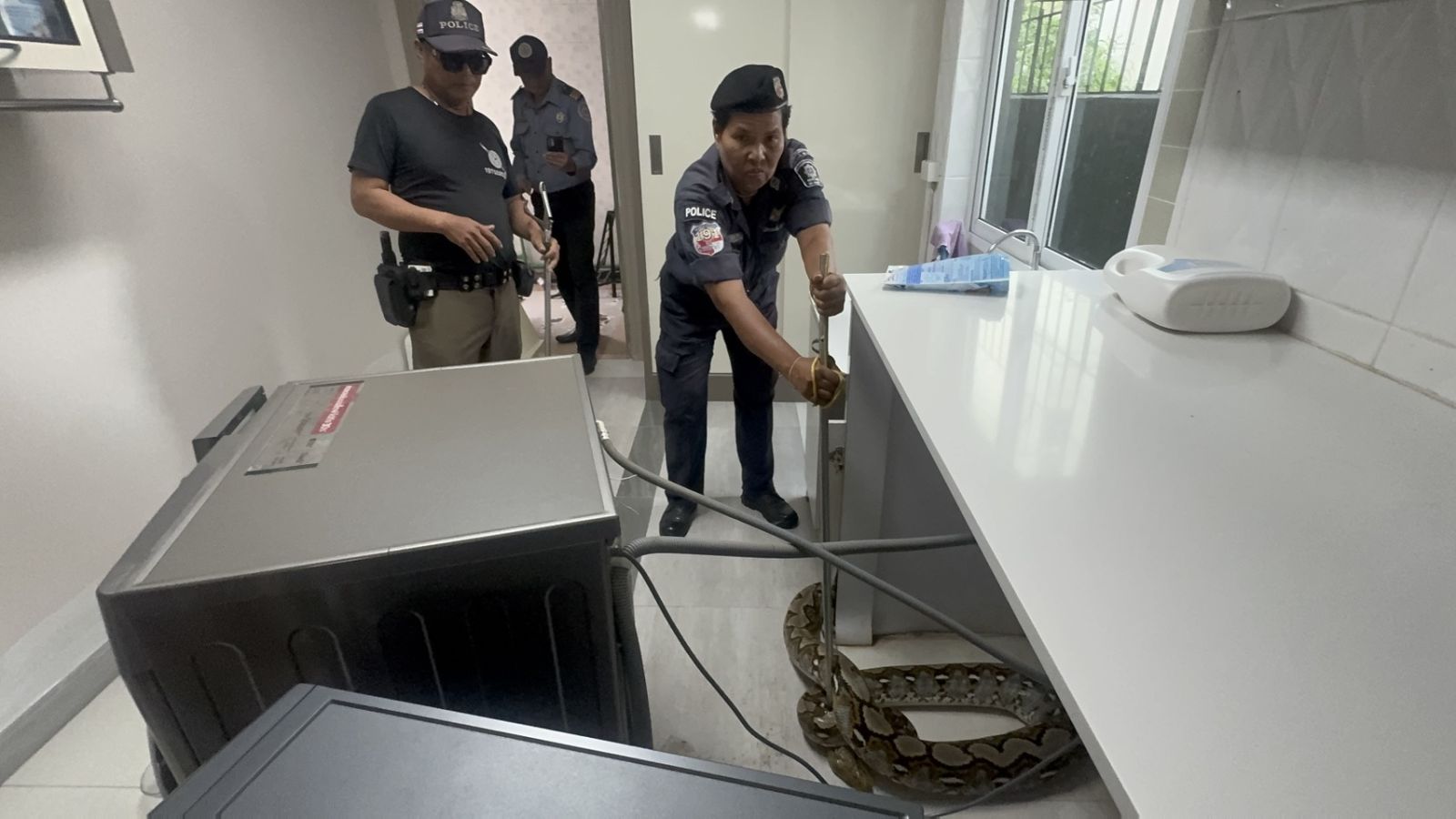 เมื่อถึงที่เกิดเหตุ พบงูเหลือขนาดใหญ่ ยาวกว่า 5 เมตร นอนขดตัวอยู่หลังเครื่องซักผ้า จึงใช้ห่วงจับงู คล้องที่หัวงู แต่งูมีความดุร้าย ฉกออกมาหลายครั้ง จนสามารถจับไว้ได้ และที่บริเวณท้องมีร่องรอยปูด ซึ่งคาดว่าได้กินลูกแล้วไปแล้ว 1 ตัว