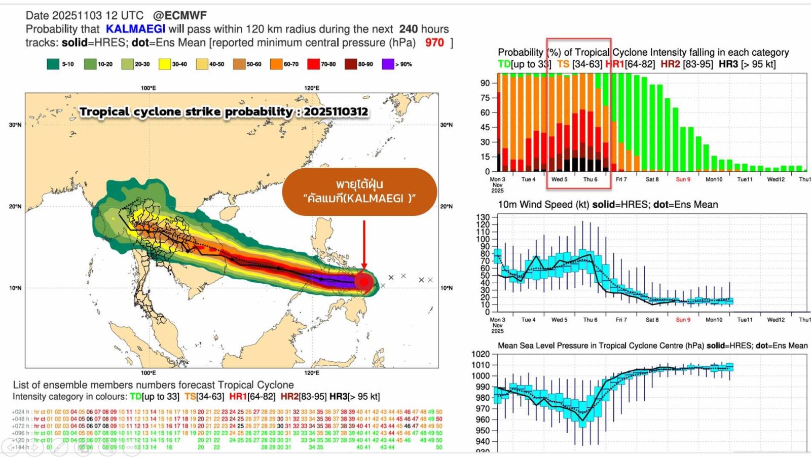 ยังมีศูนย์กลางอยู่บริเวณตอนกลางของประเทศฟิลิปปินส์ กำลังเคลื่อนตัวทางตะวันตกที่คาดว่าจะเคลื่อนลงสู่ทะเลจีนใต้ ช่วงรอยต่อระหว่างคืนวันที่ 4 ถึงเช้าวันที่ 5 พ.ย.68 และจะเคลื่อนตัวขึ้นฝั่งประเทศเวียดนามตอนกลางช่วง 6-7 พ.ย.68 หลังจากนั้นจะอ่อนกำลังลงตามลำดับ และสลายตัวเป็นหย่อมความกดอากาศต่ำกำลังแรงก่อนเคลื่อนเข้าปกคลุมประเทศไทยตอนบน โดยจะเริ่มทางภาคอีสานก่อน (จ.อุบลราชธานี) ในวันที่ 7 พ.ย.68 ถึงแม้จะอ่อนกำลังลงเป็นหย่อมความกดอากาศต่ำแล้วก็ตาม แต่ยังมีโอกาสทำให้ประเทศไทยตอนบนมีเมฆฝนเพิ่มขึ้นและมีฝนตกหนักหลายพื้นที่ โดยเฉพาะบริเวณภาคอีสาน (จ.อุบลราชธานี ศรีสะเกษ อำนาจเจริญ ยโสธร) ส่วนภาคอื่นๆ จะได้รับผลกระทบในวันถัดไป โดยจะยังต้องติดตามและประเมินเป็นระยะๆ เนื่องจากทิศทางและกำลังของพายุฯยังมีเปลี่ยนแปลง ช่วงนี้จึงต้องเตรียมความพร้อมในการรับมือ เฝ้าระวังฝนตกหนักอาจมีน้ำท่วมขังได้ และอาจส่งผลกระทบกับผลผลิตที่กำลังตากและเก็บเกี่ยว ได้รับความเสียหายได้ (ข้าวนาปี) และอาจมีน้ำขัง น้ำท่วมฉับพลัน น้ำป่าไหลหลากได้