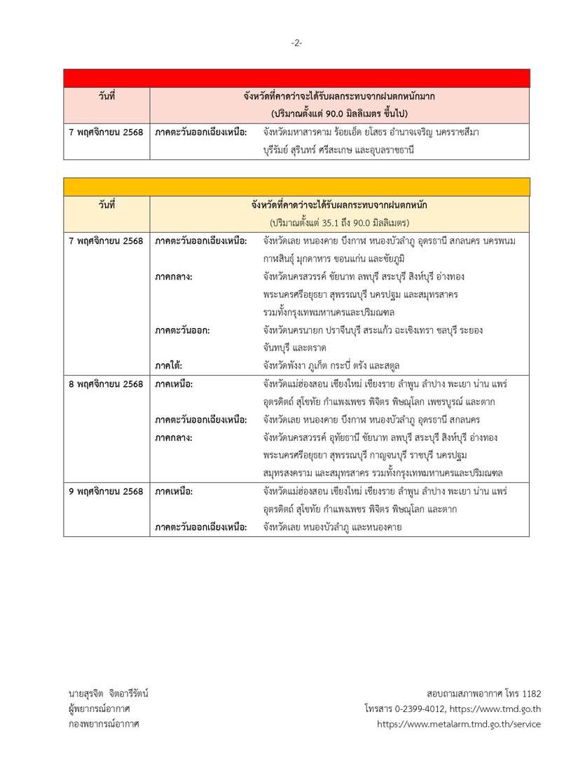 จากอิทธิพลของพายุ “คัลแมกี” ส่งผลให้ในช่วงวันที่ 7–9 พ.ย. 68 ประเทศไทยตอนบนมีฝนเพิ่มขึ้น และมีฝนตกหนัก ถึงหนักมากบางพื้นที่ โดยจะเริ่มจากบริเวณภาคตะวันออกเฉียงเหนือ ภาคตะวันออก ภาคกลาง และภาคเหนือตามลำดับ ขอให้ประชาชนในบริเวณดังกล่าวระวังอันตรายจากฝนตกหนักถึงหนักมาก และฝนที่ตกสะสม ซึ่งอาจทำให้เกิดน้ำท่วมฉับพลัน น้ำป่าไหลหลาก และน้ำล้นตลิ่ง โดยเฉพาะพื้นที่ลาดเชิงเขาใกล้ทางน้ำไหลผ่าน พื้นที่ลุ่ม และพื้นที่น้ำท่วมขัง สำหรับเกษตรกรควรเตรียมการป้องกันและระวังความเสียหายที่จะเกิดต่อผลผลิตทางการเกษตร