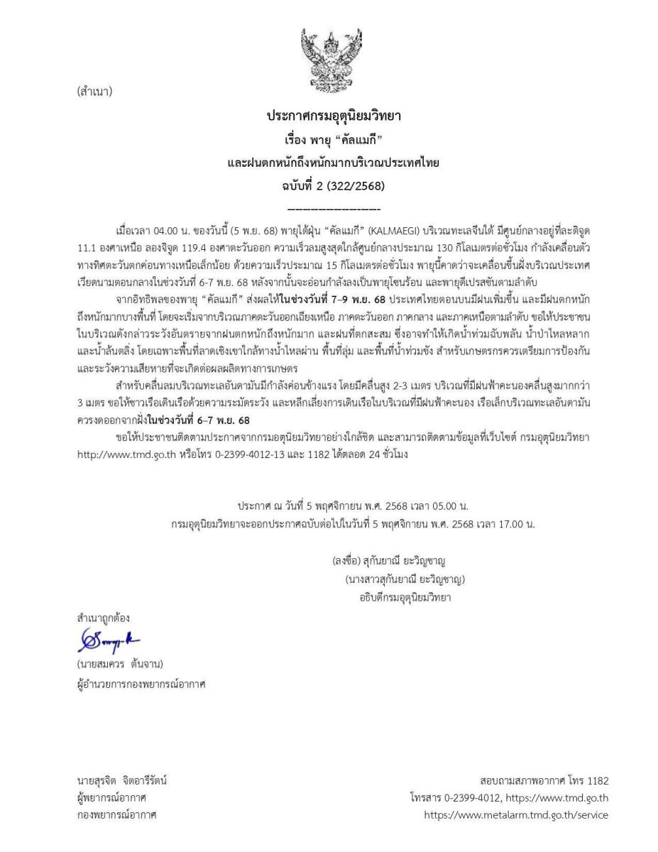 ประกาศ ณ วันที่ 5 พฤศจิกายน พ.ศ. 2568 เวลา 05.00 น. กรมอุตุนิยมวิทยาจะออกประกาศฉบับต่อไปในวันที่ 5 พฤศจิกายน พ.ศ. 2568 เวลา 17.00 น.