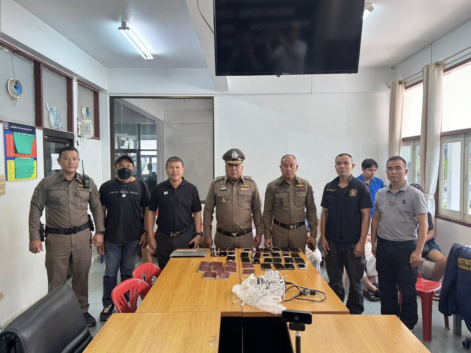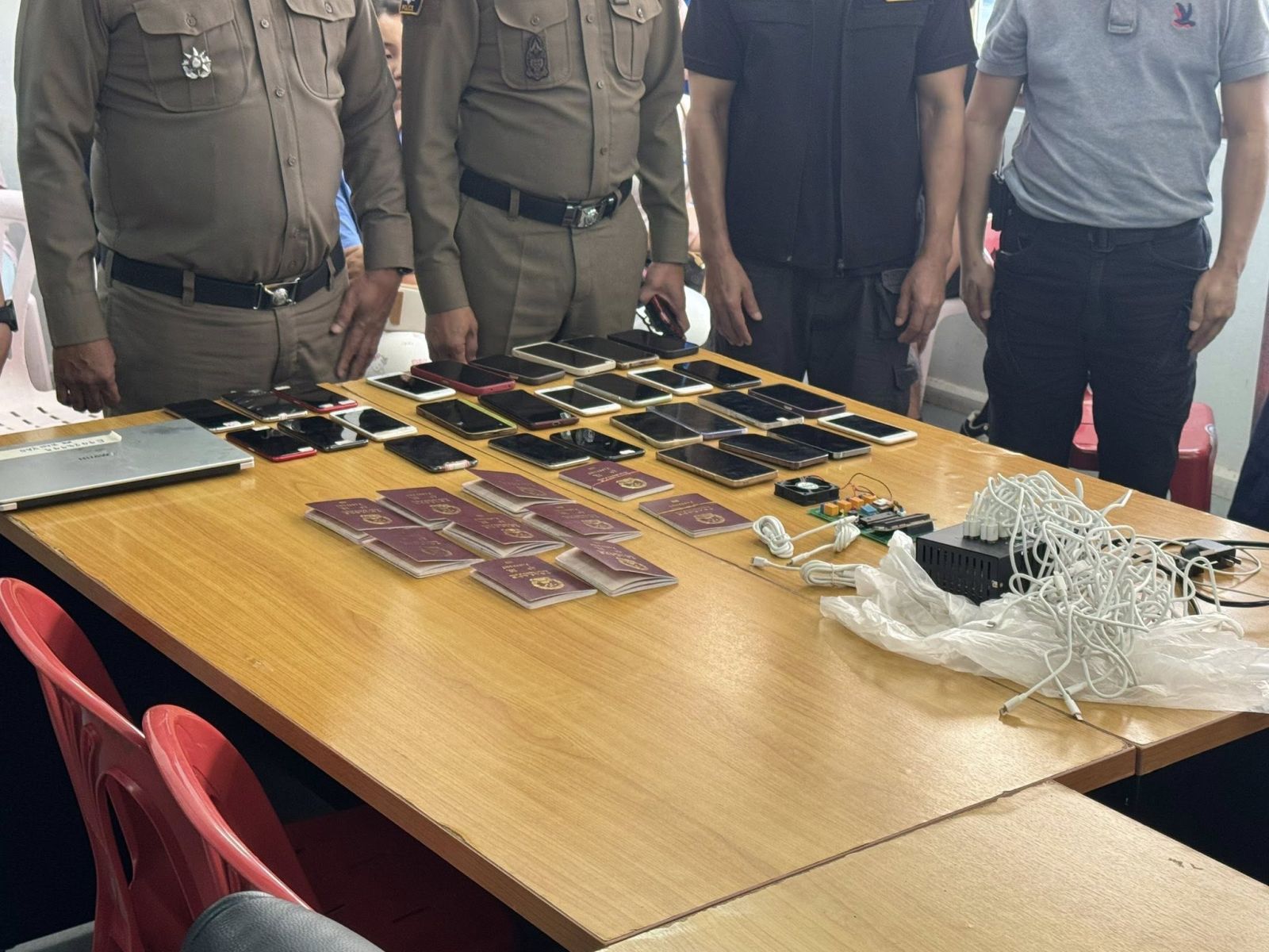 จากนั้นเจ้าหน้าที่ตำรวจได้ตรวจค้นภายในห้องพักและสัมภาระของชาวจีน พบว่ามีโทรศัพท์มือถือ 30 เครื่อง แล็ปท็อป 1 เครื่อง อุปกรณ์ขยายสัญญาณโทรศัพท์ 1 เครื่อง และสเตชั่นสำหรับชาร์จแบตโทรศัพท์ 1 เครื่อง ซึ่งอุปกรณ์ที่พบทั้งหมดเข้าข่ายเป็นอุปกรณ์ของแก๊งสแกมเมอร์ จึงยึดไว้ตรวจสอบเพิ่มเติม