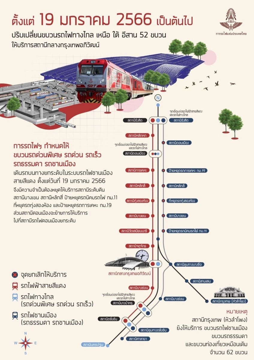 ทั้งนี้ การรถไฟฯ เริ่มจำหน่ายตั๋วล่วงหน้า 30 วัน ในวันที่ 18 ธ.ค.65 ผู้โดยสารที่ซื้อตั๋วโดยสารและเดินทางตั้งแต่วันที่ 19 มกราคม 2566 เป็นต้นไป จะปรากฏสถานีต้นทางหรือปลายทางของขบวนรถด่วนพิเศษ รถด่วน รถเร็ว เป็นสถานีกลางกรุงเทพอภิวัฒน์ (กภ.) บนตั๋วโดยสาร ทั้งนี้ ขบวนรถธรรมดา ขบวนรถชานเมือง จะยังคงใช้สถานีต้นทาง/ปลายทาง ที่สถานีกรุงเทพ (หัวลำโพง) เช่นเดิม และนับจากวันที่ 19 มกราคม 2566 ขบวนรถไฟสายเหนือ สายตะวันออกเฉียงเหนือ ทุกขบวน จะวิ่งบนโครงสร้างทางยกระดับเช่นเดียวกับรถไฟชานเมืองสายสีแดง (บางซื่อ – รังสิต) ตั้งแต่สถานีกลางกรุงเทพอภิวัฒน์ จนถึงสถานีดอนเมือง (เฉพาะที่สถานีดอนเมือง จะเป็นสถานียกระดับ) โดยจะไม่มีขบวนรถโดยสารวิ่งระดับพื้นดิน ซึ่งมีทางจุดตัดเสมอระดับทางรถไฟ-รถยนต์ 8 แห่ง บนถนนแจ้งวัฒนะ ถนนงามวงศ์วาน และจะไม่มีขบวนรถไฟโดยสารเดินบนเส้นทางรถไฟเดิมระดับดิน และจะยกเลิกการใช้ป้ายหยุดรถไฟ กม.11 สถานีบางเขน ที่หยุดรถไฟทุ่งสองห้อง สถานีหลักสี่ และที่หยุดรถการเคหะ กม.19