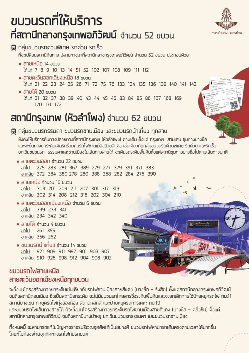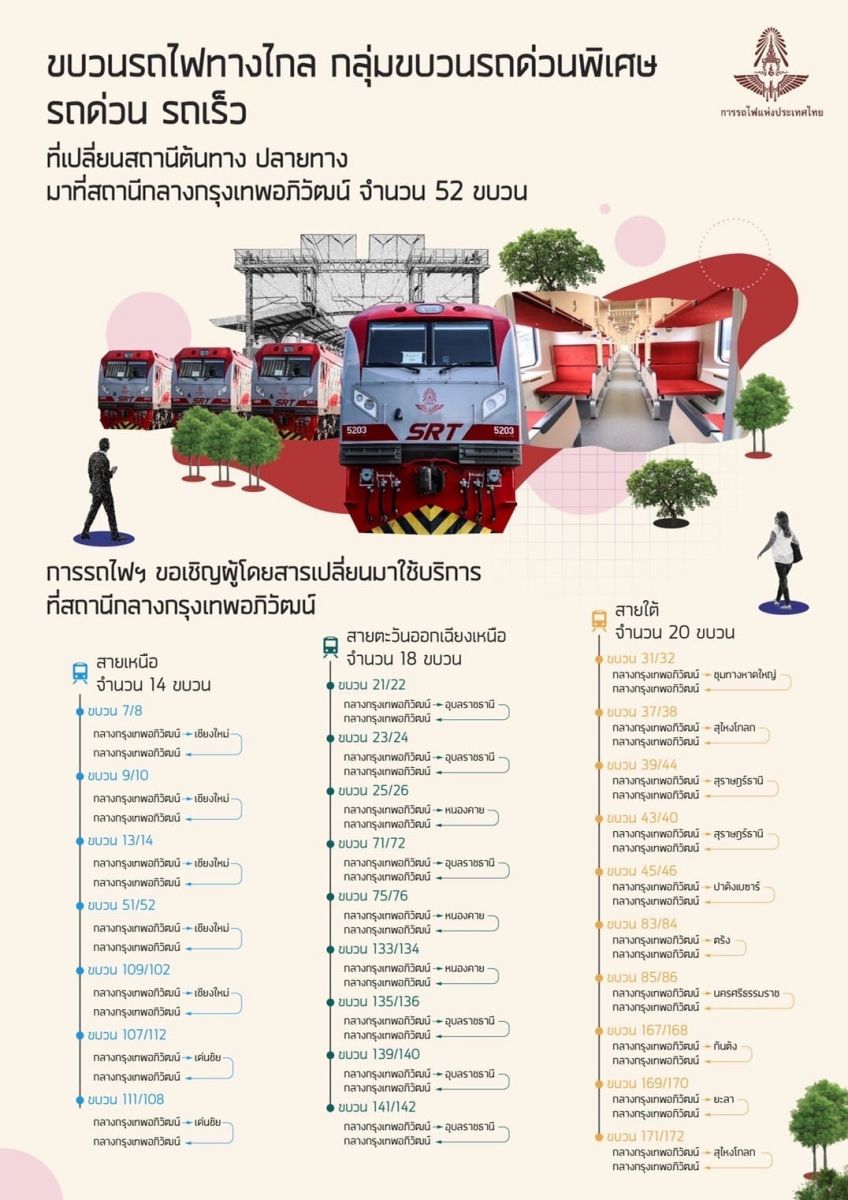 สำหรับขบวนรถไฟทางไกล กลุ่มขบวนรถด่วนพิเศษ รถด่วน รถเร็ว ที่จะเปลี่ยนสถานีต้นทาง ปลายทาง มาที่สถานีกลางกรุงเทพอภิวัฒน์ จำนวน 52 ขบวน ประกอบด้วย สายเหนือ จำนวน 14 ขบวน สายใต้ 20 ขบวน และสายตะวันออกเฉียงเหนือ 18 ขบวน