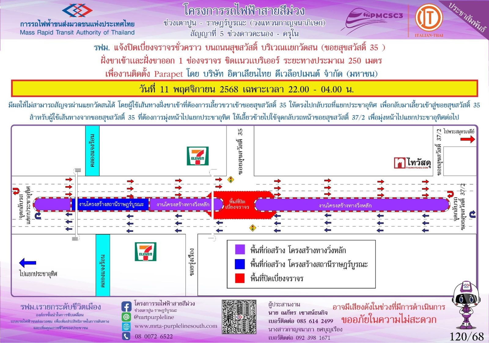 รฟม. แจ้งปิดเบี่ยงจราจรชั่วคราวบนถนนสุขสวัสดิ์ บริเวณแยกวัดสน (ซอยสุขสวัสดิ์ 35) ฝั่งขาเข้าและฝั่งขาออก 1 ช่องจราจร ชิดแนวแบริเออร์ ระยะทางประมาณ 250 เมตร เพื่องานติดตั้ง Parapet โครงการรถไฟฟ้าสายสีม่วง ช่วงเตาปูน - ราษฎร์บูรณะ (วงแหวนกาญจนาภิเษก) วันที่ 11 พฤศจิกายน 2568 เฉพาะเวลา 22.00 - 04.00 น.