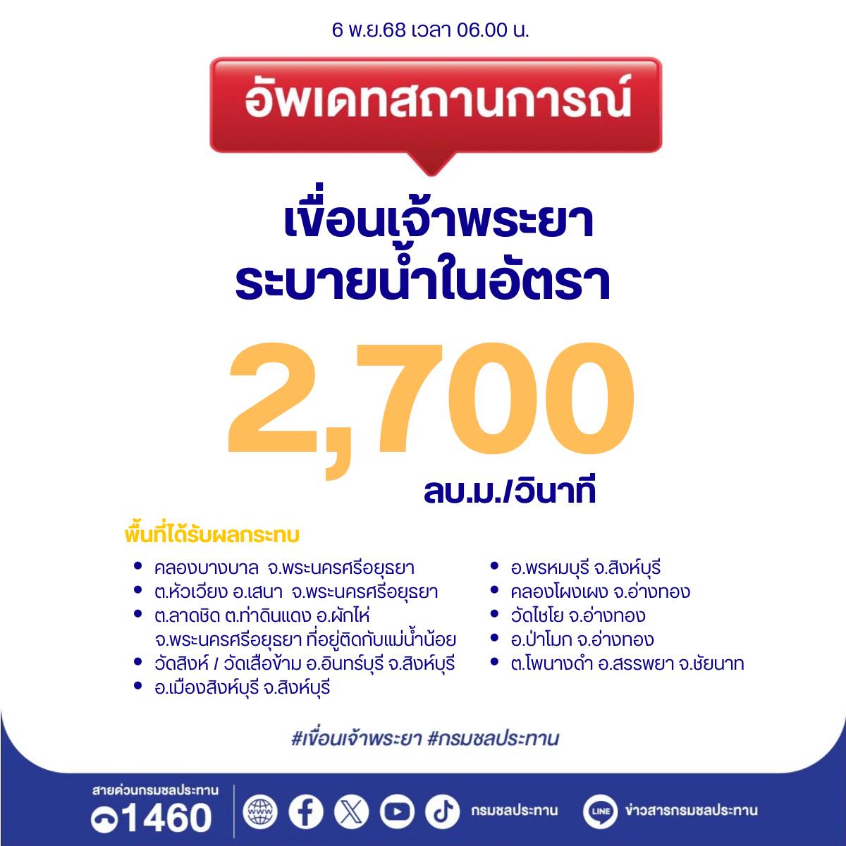 ขณะที่ กรมชลประทานอัปเดตสถานการณ์น้ำในแม่น้ำเจ้าพระยา ล่าสุดเมื่อ เวลา 06.00 น.