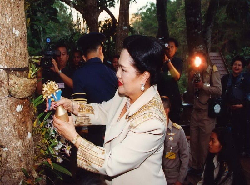ย้อนกลับไปในเดือนมีนาคม พ.ศ. 2534 สมเด็จพระพันปีหลวงได้เสด็จพระราชดำเนินไปทอดพระเนตรความงดงามของธรรมชาติและพรรณไม้ ณ บริเวณลานสุริยัน หน่วยพิทักษ์ป่าโคกนกกะบา ภายในเขตรักษาพันธุ์สัตว์ป่าภูหลวง ในครั้งนั้น ทรงสนพระราชหฤทัยในกล้วยไม้อิงอาศัยชนิดหนึ่ง ซึ่งมีลักษณะโดดเด่น คือ ดอกมีขนาดเล็ก กลีบสีขาวบริสุทธิ์ มีเส้นตามยาวสีแดงเข้มพาดผ่าน และมีกลีบปากที่เป็นสีเหลืองเข้มตัดกับแต้มสีแดงเข้มที่โคนกลีบ