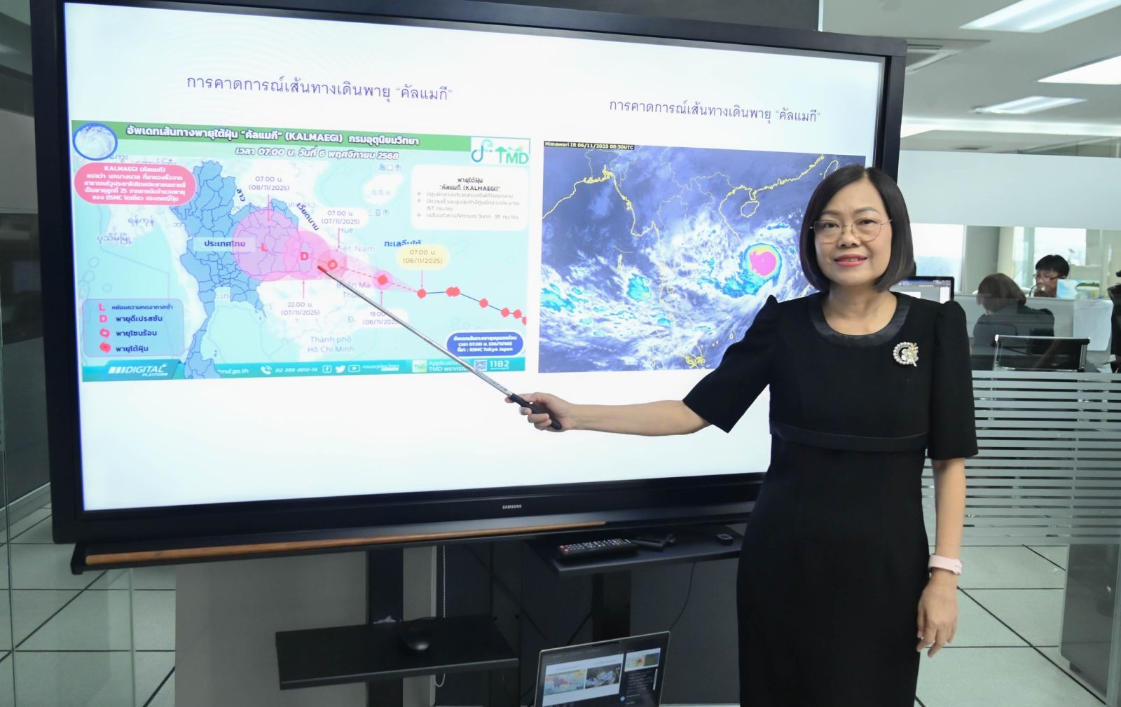 วันนี้ (6 พฤศจิกายน 2568) เวลา 10.30 น. กรมอุตุนิยมวิทยาจัดแถลงข่าวสถานการณ์พายุไต้ฝุ่น “คัลแมกี” (KALMAEGI) ณ ศูนย์ปฏิบัติการพยากรณ์อากาศ ชั้น 11 กองพยากรณ์อากาศ อาคาร 50 ปี อุตุนิยมวิทยา โดยมี ดร.สุกันยาณี ยะวิญชาญ อธิบดีกรมอุตุนิยมวิทยา เป็นผู้ให้ข้อมูลแก่สื่อมวลชนเกี่ยวกับแนวโน้มการเคลื่อนตัวของพายุและผลกระทบต่อประเทศไทยในช่วงวันที่ 7–9 พฤศจิกายน 2568