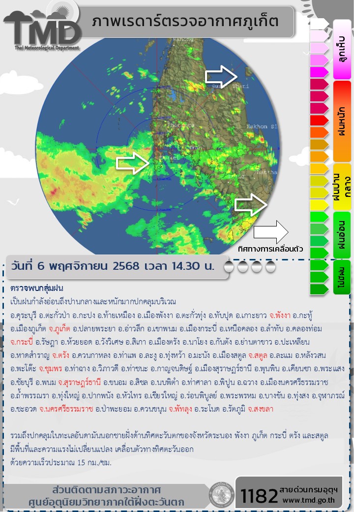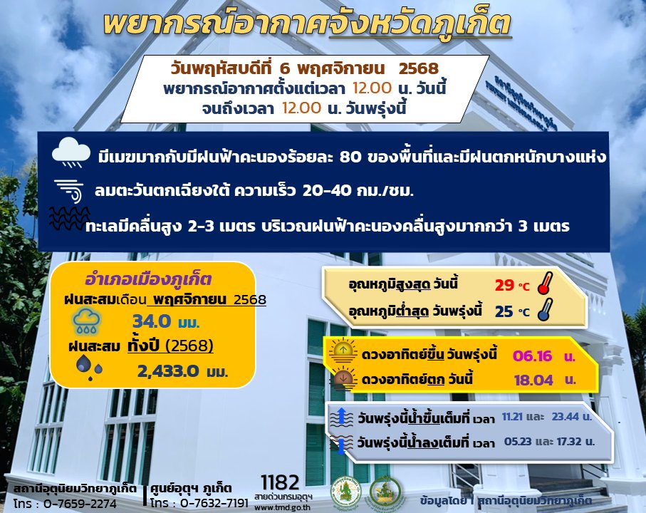 6 พ.ย.2568 สถานีอุตุนิยมวิทยาจังหวัดภูเก็ต โพสต์รายงานเมื่อ 13.25 น. พยากรณ์อากาศตั้งแต่เวลา 12.00 น. วันนี้ จนถึงเวลา 12.00 น. ของวันพรุ่งนี้ พื้นที่มีเมฆมากกับมีฝนฟ้าคะนองร้อยละ 80 ของพื้นที่และมีฝนตกหนักบางแห่ง ทะเลมีคลื่นสูง 2-3 เมร บริเวณฝนฟ้าคะนองคลื่นสูงมากกว่า 3 เมตร ล่าสุดเวลา 14.30 น. พบกลุ่มฝนกำลังอ่อนถึงปานกลางและหนักมากปกคลุม