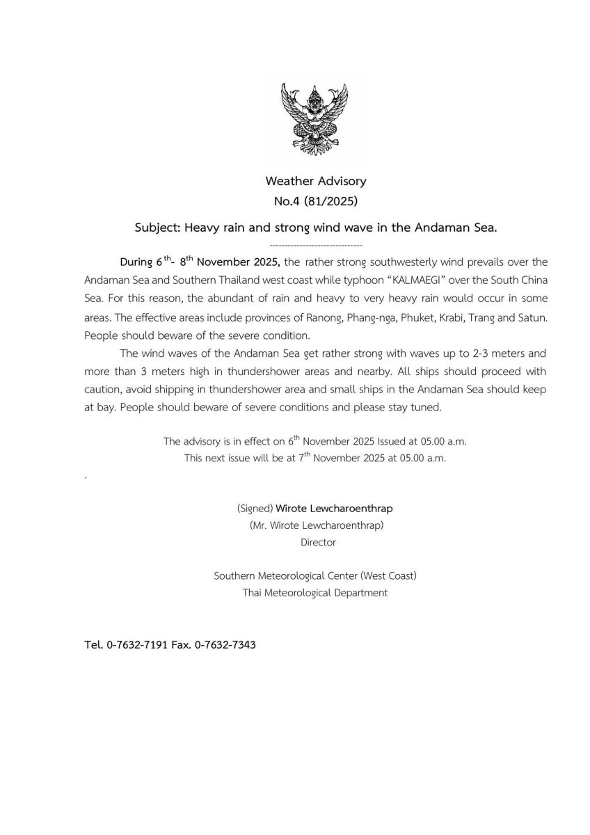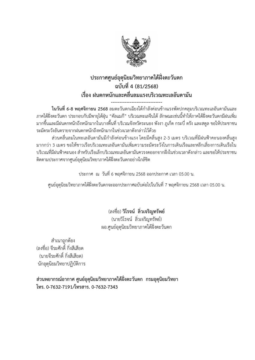 ขณะที่วันนี้ มีประกาศจากศูนย์อุตุนิยมวิทยาภาคใต้ฝั่งตะวันตก ฉบับที่ 4 (81/2568) เรื่อง ฝนตกหนักและคลื่นลมแรงบริเวณทะเลอันดามัน ในวันที่ 6-8 พฤศจิกายน 2568 ลมตะวันตกเฉียงใต้กําลังค่อนข้างแรงพัดปกคลุมบริเวณทะเลอันดามันและ ภาคใต้ฝั่งตะวันตก ประกอบกับมีพายุไต้ฝุ่น “คัลแมกี” บริเวณทะเลจีนใต้ ลักษณะเช่นนี้ทําให้ภาคใต้ฝั่งตะวันตกมีฝนเพิ่ม มากขึ้นและมีฝนตกหนักถึงหนักมากในบางพื้นที่ บริเวณจังหวัดระนอง พังงา ภูเก็ต กระบี่ ตรัง และสตูล ขอให้ประชาชน ระมัดระวังอันตรายจากฝนตกหนักถึงหนักมากในช่วงเวลาดังกล่าวไว้ด้วย