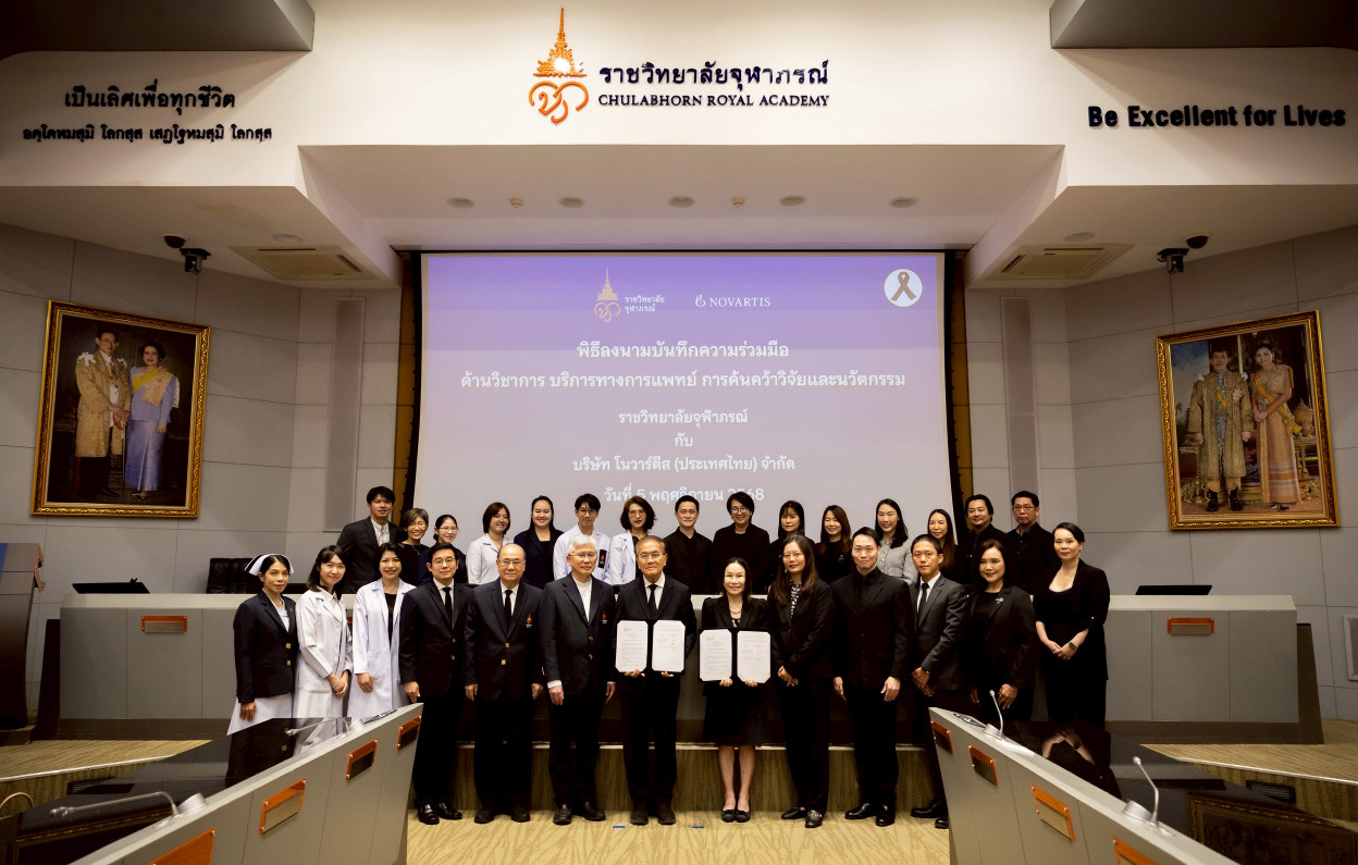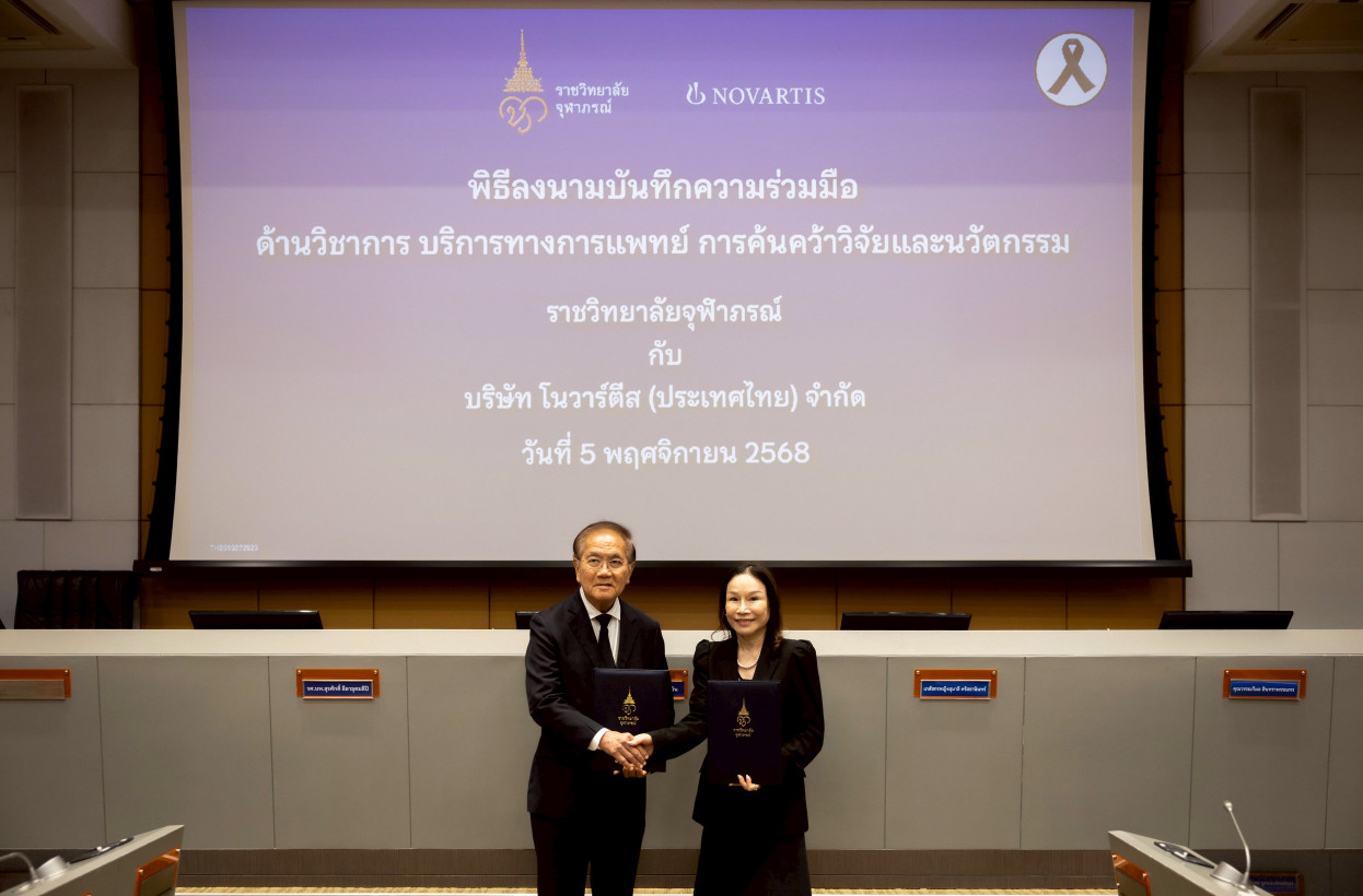 5 พฤศจิกายน 2568 : ราชวิทยาลัยจุฬาภรณ์ และบริษัท โนวาร์ตีส (ประเทศไทย) จำกัด ร่วมลงนามในบันทึกข้อตกลงความร่วมมือ (MOU) ทางด้านวิชาการ บริการทางการแพทย์ การค้นคว้าวิจัย และนวัตกรรม โดยมี ศาสตราจารย์เกียรติคุณ นายแพทย์รัชตะ รัชตะนาวิน รักษาการรองเลขาธิการราชวิทยาลัยจุฬาภรณ์ พร้อมด้วย รองศาสตราจารย์ นายแพทย์สุรศักดิ์ ลีลาอุดมลิปิ ผู้อำนวยการโรงพยาบาลจุฬาภรณ์ และ เภสัชกรหญิงสุมาลี คริสธานินทร์ ประธานบริหาร บริษัท โนวาร์ตีส (ประเทศไทย) จำกัด พร้อมด้วย คุณวรรณวิมล สินทราพรรณทร ผู้แทนของบริษัท โนวาร์ตีส (ประเทศไทย) จำกัด ร่วมลงนามในบันทึกข้อตกลงความร่วมมือดังกล่าว พร้อมกันนี้ คุณซัง ลี ผู้อำนวยการฝ่ายสื่อสารองค์กรและการสนับสนุนผู้ป่วย โนวาร์ติส ภาคพื้นเอเชียแปซิฟิคตะวันออกกลาง และแอฟริกา ร่วมกล่าวสุนทรพจน์ ภายในงาน พิธีดังกล่าวจัดขึ้น ณ ห้องประชุมใหญ่ ชั้น 3 อาคารสำนักงานราชวิทยาลัยจุฬาภรณ์ เขตหลักสี่ กรุงเทพมหานคร
