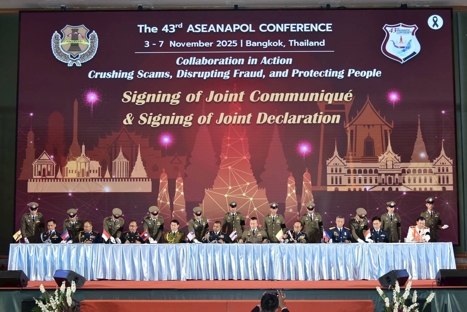 ทั้งนี้ หัวหน้าตำรวจอาเซียนทั้ง 10 ประเทศ ได้ร่วมลงนามแถลงการณ์ร่วมการประชุมหัวหน้าตำรวจอาเซียน ครั้งที่ 43 โดยมีมติในการร่วมมือปราบปรามอาชญากรรมข้ามชาติ 8 ด้าน ได้แก่ การลักลอบค้ายาเสพติด, การลักลอบค้าอาวุธ, การก่อการร้าย, การค้ามนุษย์, อาชญากรรมเกี่ยวกับสัตว์ป่า, อาชญากรรมทางการเงิน, อาชญากรรมทางไซเบอร์ และอาชญากรรมทางทะเล โดยมุ่งเน้นการปราบปรามสแกมเมอร์ และการค้ามนุษย์