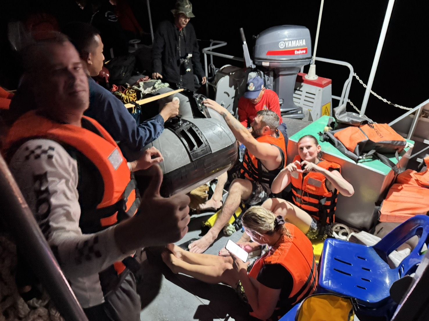 กระทั้งเวลา 00.10 น. พล.ร.ต.สถาพร วาจรัตน์ เสนาธิการทัพเรือภาคที่ 3 พร้อมหน่วยงานต่างๆ ที่เกี่ยวข้อง รับตัวผู้ประสบเหตุขึ้นจากเรือ ต.272 ทั้ง 4 คนปลอดภัยดี แต่มีอาการอ่อนเพลียเล็กน้อย ส่วนนักท่องเที่ยวผู้หญิงมีอาการตกใจกับเหตุการณ์ที่เกิดขึ้น จากนั้นได้ส่งมอบนักท่องเที่ยวทั้ง 4 รายให้กับหน่วยงานที่เกี่ยวข้อง การปฏิบัติภารกิจครั้งนี้เป็นไปด้วยความเรียบร้อยกำลังพลปลอดภัย