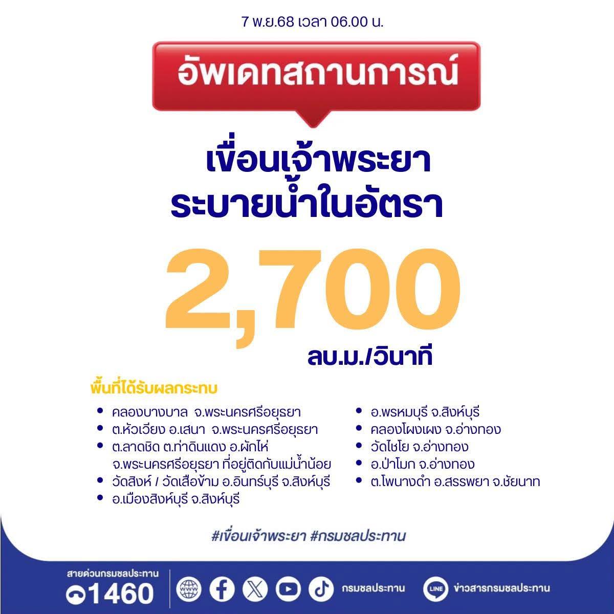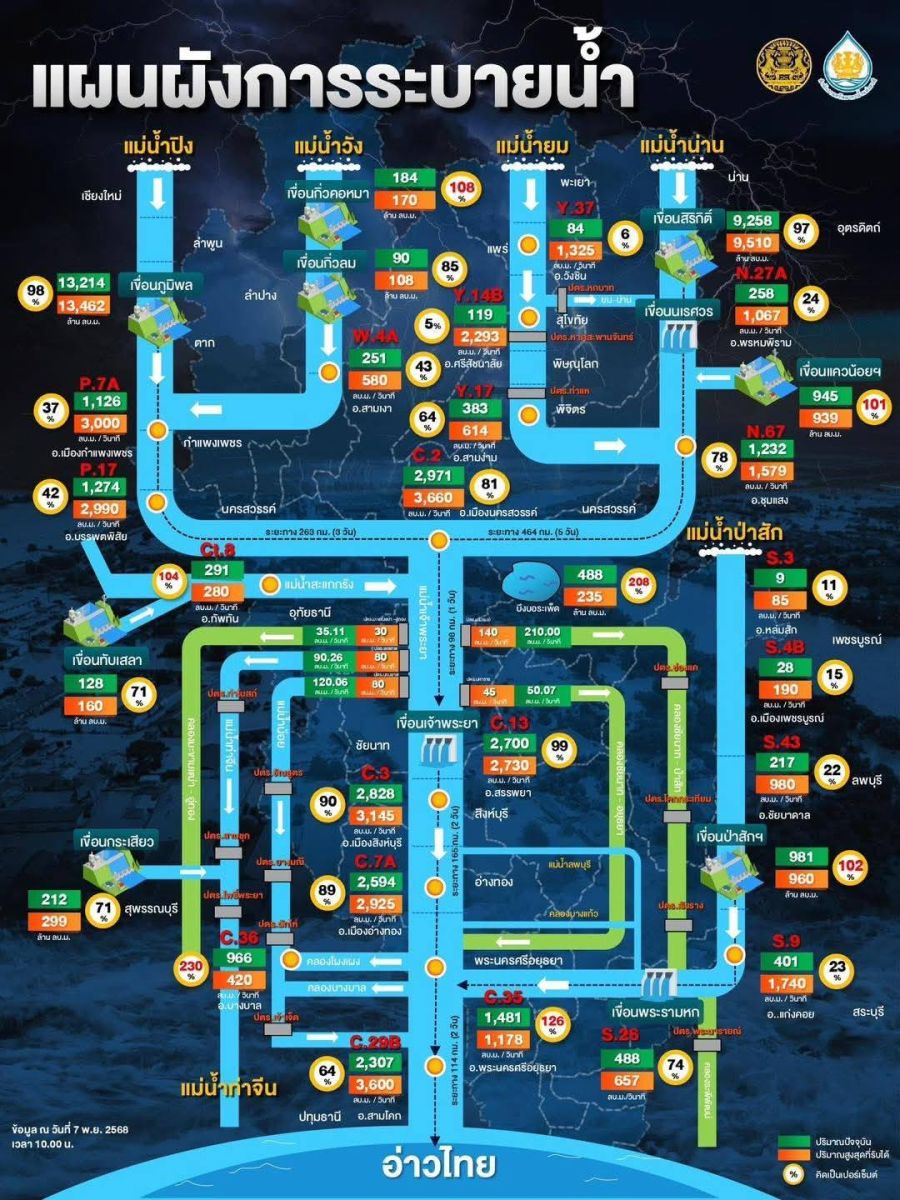 วันนี้(7 พ.ย.68) เมื่อเวลา 10.00 น. สำนักงานทรัพยากรน้ำแห่งชาติ (สทนช.) รายงาน “แผนผังการระบายน้ำ” ประจำวัน พบว่า ปัจจุบันปริมาณน้ำในลุ่มน้ำเจ้าพระยาและป่าสักยังคงมีระดับสูง โดยเฉพาะเขื่อนพระรามหกและเขื่อนป่าสักชลสิทธิ์ ที่มีการระบายน้ำออกอย่างต่อเนื่องเพื่อรองรับน้ำเหนือจากภาคกลางตอนบน ขณะที่พื้นที่นครสวรรค์และชัยนาทมีอัตราการไหลผ่านเกิน 2,700 ลูกบาศก์เมตรต่อวินาที