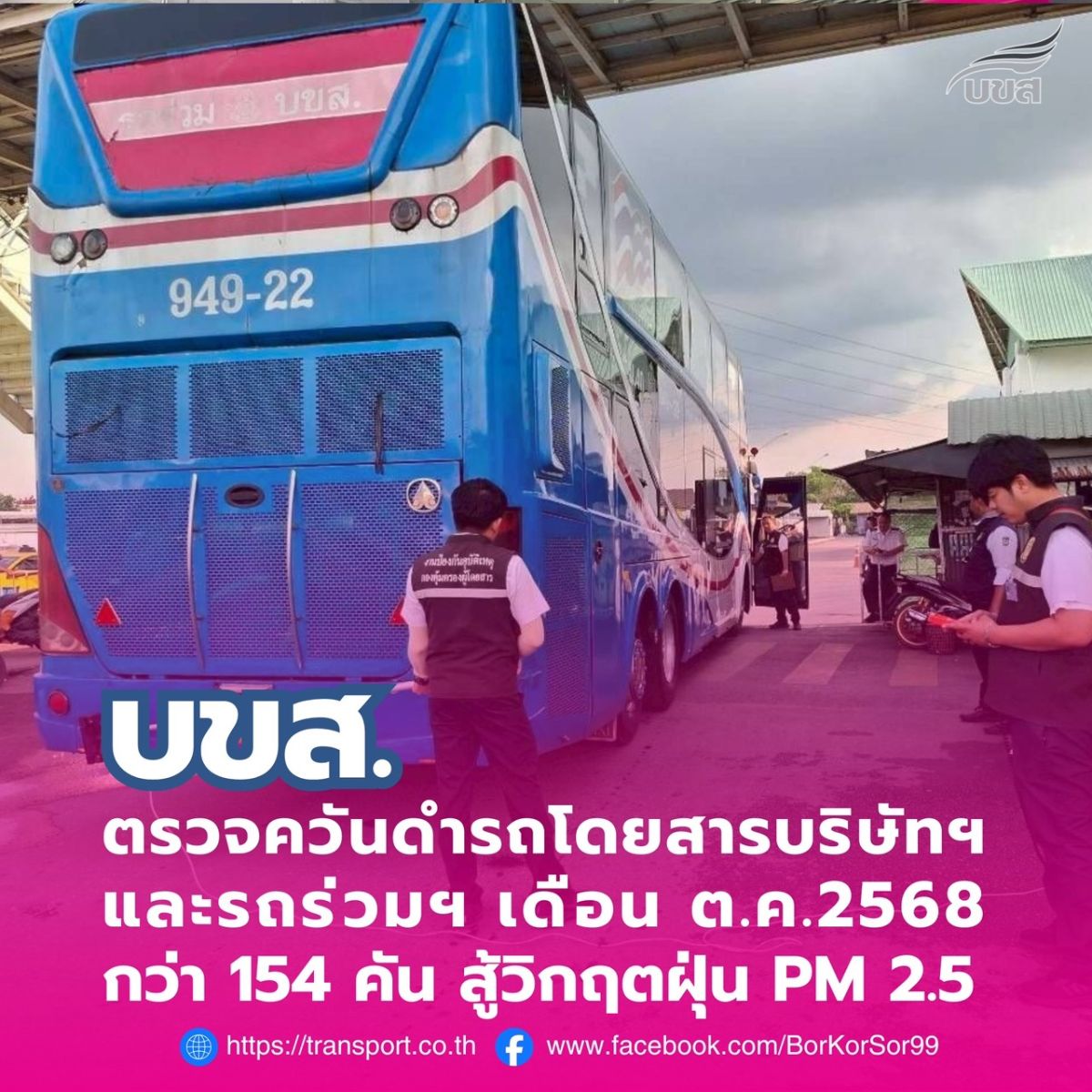 1.จัดเจ้าหน้าที่สุ่มตรวจสภาพความพร้อมค่าควันดำของรถโดยสารบริษัท – รถร่วมฯ ณ สถานีขนส่งผู้โดยสารกรุงเทพ 5 แห่ง ได้แก่ สถานีขนส่งผู้โดยสารกรุงเทพ (จตุจักร) หรือหมอชิต 2, เอกมัย, สายใต้บรมราชชนนี, ปิ่นเกล้า และสถานีเดินรถโดยสารขนาดเล็ก (จตุจักร) ตั้งแต่วันที่ 1 – 31 ตุลาคม 2568 รวมทั้งหมด 154 คัน แบ่งเป็นรถ บขส. จำนวน 68 คัน และรถร่วมฯ จำนวน 86 คัน ยังไม่ตรวจพบรถโดยสารมีค่าควันดำเกินมาตรฐานที่กรมควบคุมมลพิษกำหนด และหากพบว่ารถโดยสารมีค่าควันดำเกินมาตรฐานต้องนำรถไปแก้ไขปรับปรุงให้แล้วเสร็จก่อนนำรถโดยสารออกมาให้บริการประชาชน