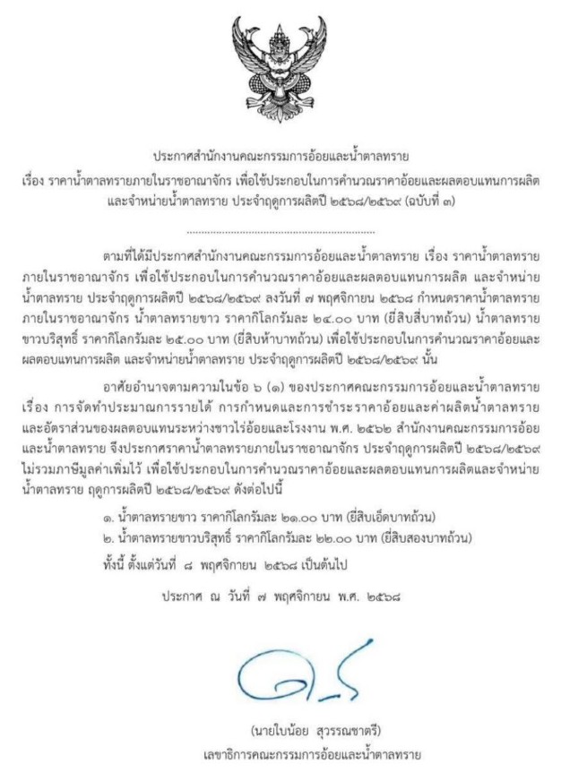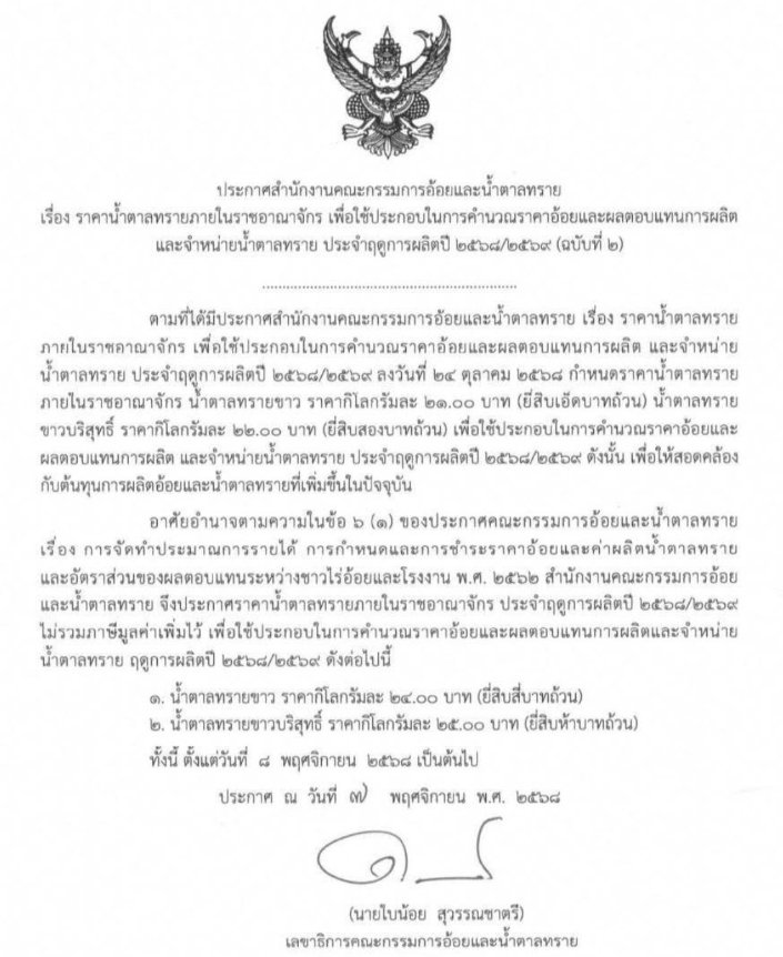 8 พฤศจิกายน 2568 ผู้สื่อข่าวรายงานว่า หลังจากที่ นายใบน้อย สุวรรณชาตรี เลขาธิการคณะกรรมการอ้อยและน้ำตาลทราย (สอน.) ได้ออกประกาศด่วน เรื่องการปรับราคาน้ำตาลทรายในราชอาณาจักร เพื่อใช้ประกอบในการคำนวณราคาอ้อยและผลตอบแทนการผลิตและจำหน่ายน้ำตาลทราย ประจำฤดูการผลิตปี 2568/2569 โดยขึ้นราคาน้ำตาลทรายขาว เป็นราคากิโลกรัมละ 24 บาท จากเดิมกิโลกรัม 21 บาท และขึ้นราคาน้ำตาลทรายขาวบริสุทธิ์ เป็นราคา กก.ละ 25 บาท จาก กก.ละ 22 บาท มีผลตั้งแต่วันที่ 8 พฤศจิกายน 2568 เพื่อให้เป็นไปตามต้นทุนการผลิต และนำส่วนต่างที่เพิ่มขึ้นมาคำนวณรายได้ให้ชาวไร่อ้อยคิดเป็น 50 บาท ต่อตันอ้อย