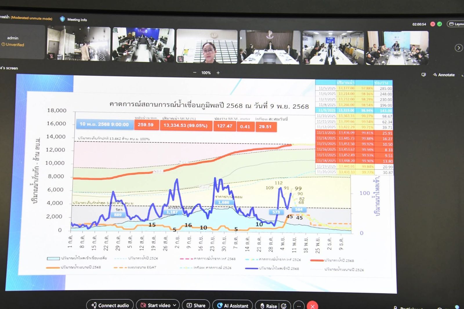 วันนี้ (10 พฤศจิกายน 2568) นายไพฑูรย์ เก่งการช่าง รองเลขาธิการสำนักงานทรัพยากรน้ำแห่งชาติ (สทนช.) เป็นประธานการประชุมปรึกษาหารือการติดตามสภาพอากาศ สถานการณ์น้ำ และการคาดการณ์ เพื่อปรับแผนบริหารจัดการน้ำให้สอดคล้องกับสถานการณ์ โดยมีผู้ทรงคุณวุฒิและผู้แทนหน่วยงานที่เกี่ยวข้อง เข้าร่วมประชุม ณ อาคารจุฑามาศ สำนักงานทรัพยากรน้ำแห่งชาติ และผ่านสื่ออิเล็กทรอนิกส์ โดยรองเลขาธิการ สทนช. เปิดเผยภายหลังการประชุมว่า ในปีนี้มีฝนตกเหนือเขื่อนเจ้าพระยามากเป็นอันดับ 2 รองจากปี 2565 โดยเฉพาะในช่วงเดือนพฤศจิกายนที่มีฝนตกหนักจากอิทธิพลทางอ้อมของพายุ “คัลแมกี” แม้ว่ากรมอุตุนิยมวิทยาจะประกาศเข้าสู่ช่วงฤดูหนาวอย่างเป็นทางการตั้งแต่ปลายเดือนตุลาคมที่ผ่านมา ส่งผลให้มีมวลน้ำระลอกใหม่ไหลเข้าเขื่อนภูมิพลเพิ่มเติม ปัจจุบันเหลือช่องว่างรองรับน้ำอยู่อีกเพียงประมาณ 127 ล้านลูกบาศก์เมตร (ลบ.ม.) ที่ประชุมจึงได้หารือร่วมกันเพื่อหาแนวทางในการบริหารจัดการน้ำโดยไม่ต้องเปิดทางระบายน้ำล้นฉุกเฉินของเขื่อน (Spillway) โดยมีมติเห็นชอบให้ทยอยปรับเพิ่มการระบายน้ำเขื่อนภูมิพล โดยในวันนี้จะปรับจากอัตราเดิม 45 ล้าน ลบ.ม. ต่อวัน เป็น 48 ล้าน ลบ.ม. ต่อวัน จากนั้นในวันที่ 11 พฤศจิกายน 2568 จะปรับเพิ่มเป็น 53 ล้าน ลบ.ม. ต่อวัน และในวันที่ 12 พฤศจิกายน 2568 จะปรับเพิ่มเป็น 55 ล้าน ลบ.ม. ต่อวัน หากจำเป็นต้องระบายน้ำเพิ่มเติมจะไม่เกิน 60 ล้าน ลบ.ม. ต่อวัน ทั้งนี้ มวลน้ำดังกล่าวจะไหลต่อเนื่องลงสู่พื้นที่ตอนล่าง คาดว่าจะมีปริมาณน้ำไหลผ่านจังหวัดนครสวรรค์สูงสุดประมาณ 3,100 ลบ.ม. ต่อวินาที และมีระดับน้ำเหนือเขื่อนเจ้าพระยาเพิ่มขึ้นจากปัจจุบัน +17.77 เมตร จากระดับทะเลปานกลาง เป็นประมาณ +18.00 เมตร จากระดับทะเลปานกลาง ซึ่งจะส่งผลกระทบต่อจังหวัดอุทัยธานีและชัยนาท ในส่วนของท้ายเขื่อนเจ้าพระยา จะเริ่มเพิ่มการระบายน้ำตั้งแต่วันนี้ จากอัตรา 2,800 ลบ.ม. ต่อวินาที เป็น 2,900 ลบ.ม. ต่อวินาที และคงอัตราดังกล่าวต่อเนื่อง ซึ่งยังต่ำกว่าปี 2554 ที่มีการระบายน้ำท้ายเขื่อนเจ้าพระยาสูงสุด 3,700 ลบ.ม. ต่อวินาที