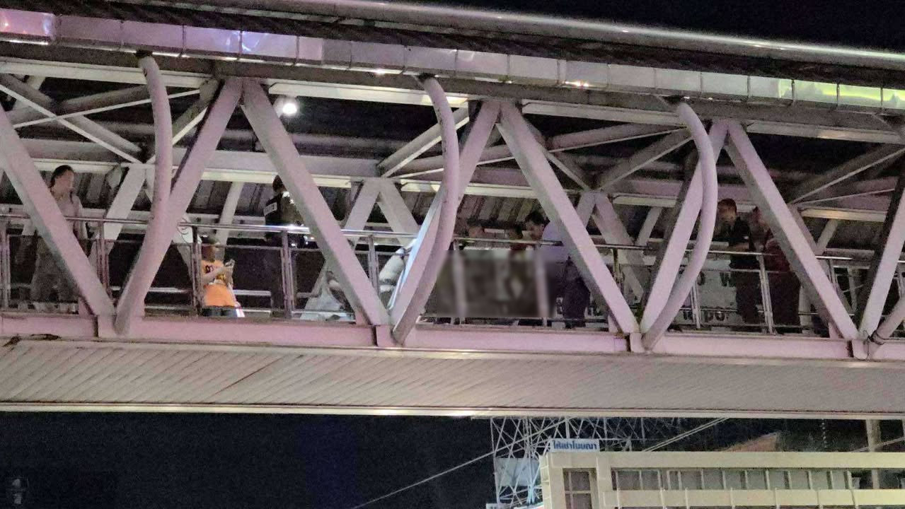 ที่เกิดเหตุพบชายไทย นายเอ (นามสมมุติ) อายุ 46 ปี เกาะราวเหล็กสะพานลอยสูงราว 6–8 เมตร ห้อยตัวอยู่ด้านนอกในท่าทางหวาดเสียว เจ้าหน้าที่รีบขึ้นไปเกลี้ยกล่อมและพยายามดึงตัวกลับขึ้นมา แต่ผู้ก่อเหตุขัดขืนไม่ยอม ก่อนที่ตำรวจจะอาศัยจังหวะเผลอคว้าตัวไว้ได้อย่างปลอดภัย ท่ามกลางเสียงร้องตะโกนด้วยความตกใจ ห้ามปราม ของประชาชนที่ผ่านไปมา