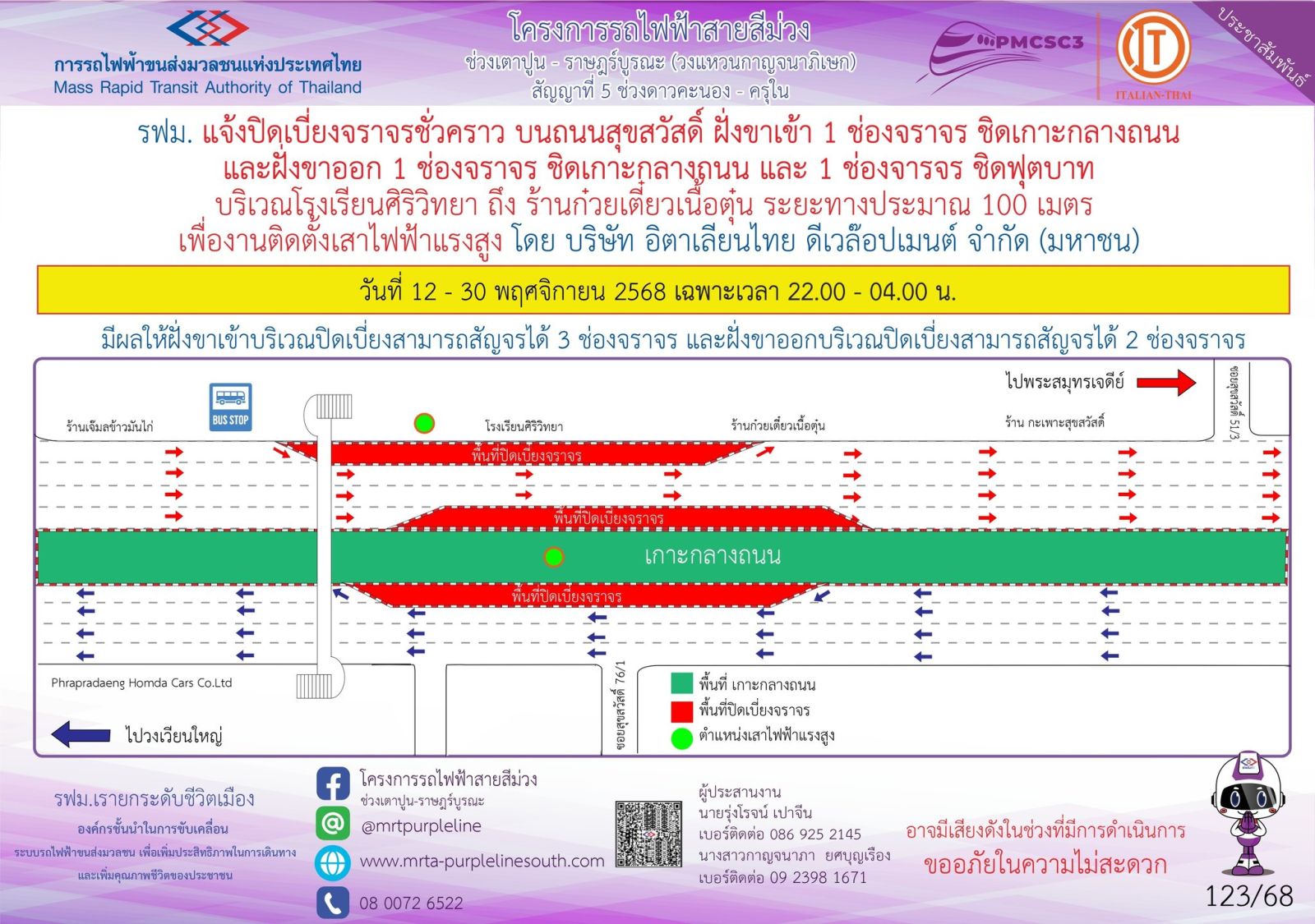 รฟม. แจ้งปิดเบี่ยงจราจรชั่วคราว บนถนนสุขสวัสดิ์ ฝั่งขาเข้า 1 ช่องจราจร ชิดเกาะกลางถนน และฝั่งขาออก 1 ช่องจราจร ชิดเกาะกลางถนน และ 1 ช่องจราจร ชิดฟุตบาท บริเวณโรงเรียนศิริวิทยา ถึง ร้านก๋วยเตี๋ยวเนื้อตุ๋น ระยะทางประมาณ 100 เมตร เพื่องานติดตั้งเสาไฟฟ้าแรงสูง โครงการรถไฟฟ้าสายสีม่วง ช่วงเตาปูน - ราษฎร์บูรณะ (วงแหวนกาญจนาภิเษก) วันที่ 12 - 30 พฤศจิกายน 2568 เฉพาะเวลา 22.00 - 04.00 น.