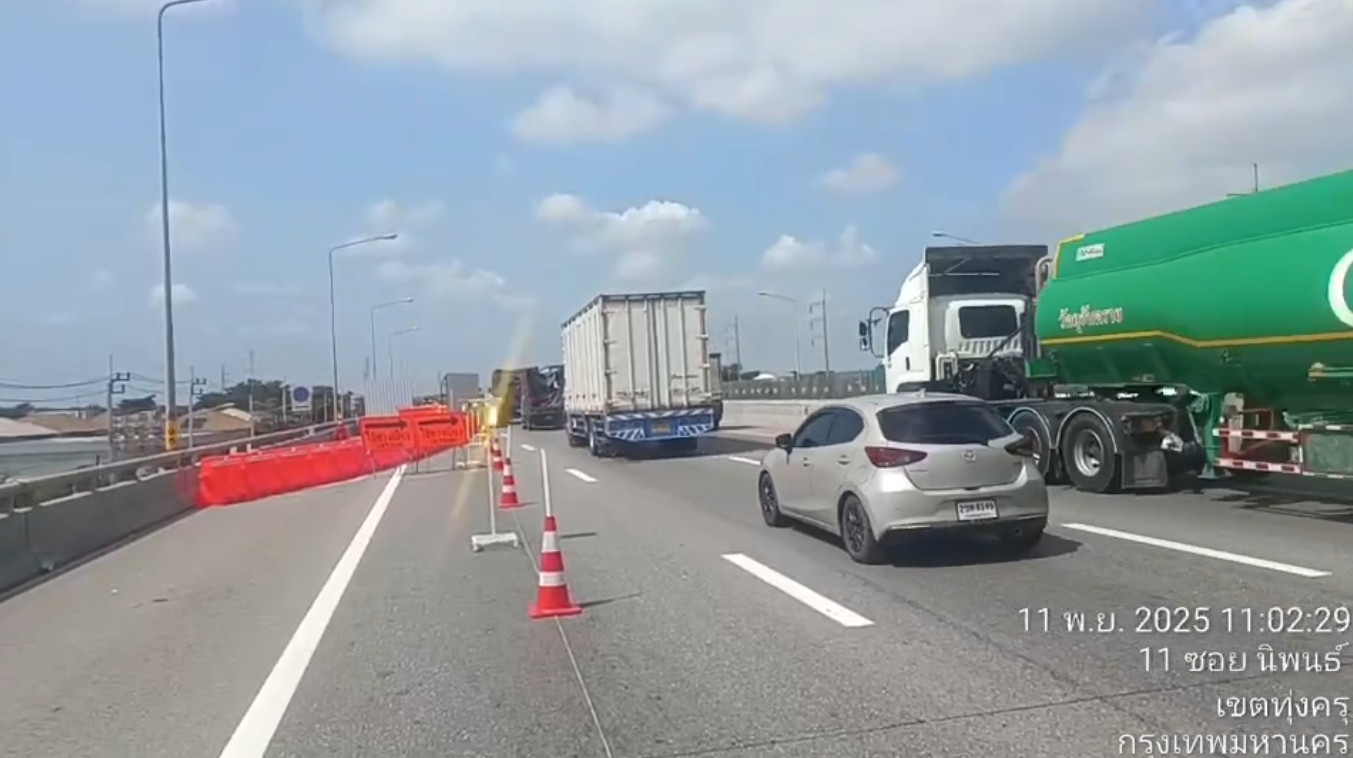 11 พ.ย.68 สภาพการจราจรบริเวณแนวซ่อมทาง ก่อนถึงจุดดังกล่าวปริมาณรถมากเบียดแทรก เคลื่อนตัวตามกันได้ตลอดไม่หยุดนิ่ง ท้ายแถว อยู่จุดร่วมปู่เจ้าฯ ก่อนขึ้นสะพานกาญจนาฯ ผ่านบริเวณแนวซ่อมทางแล้ว การจราจรคล่องตัว