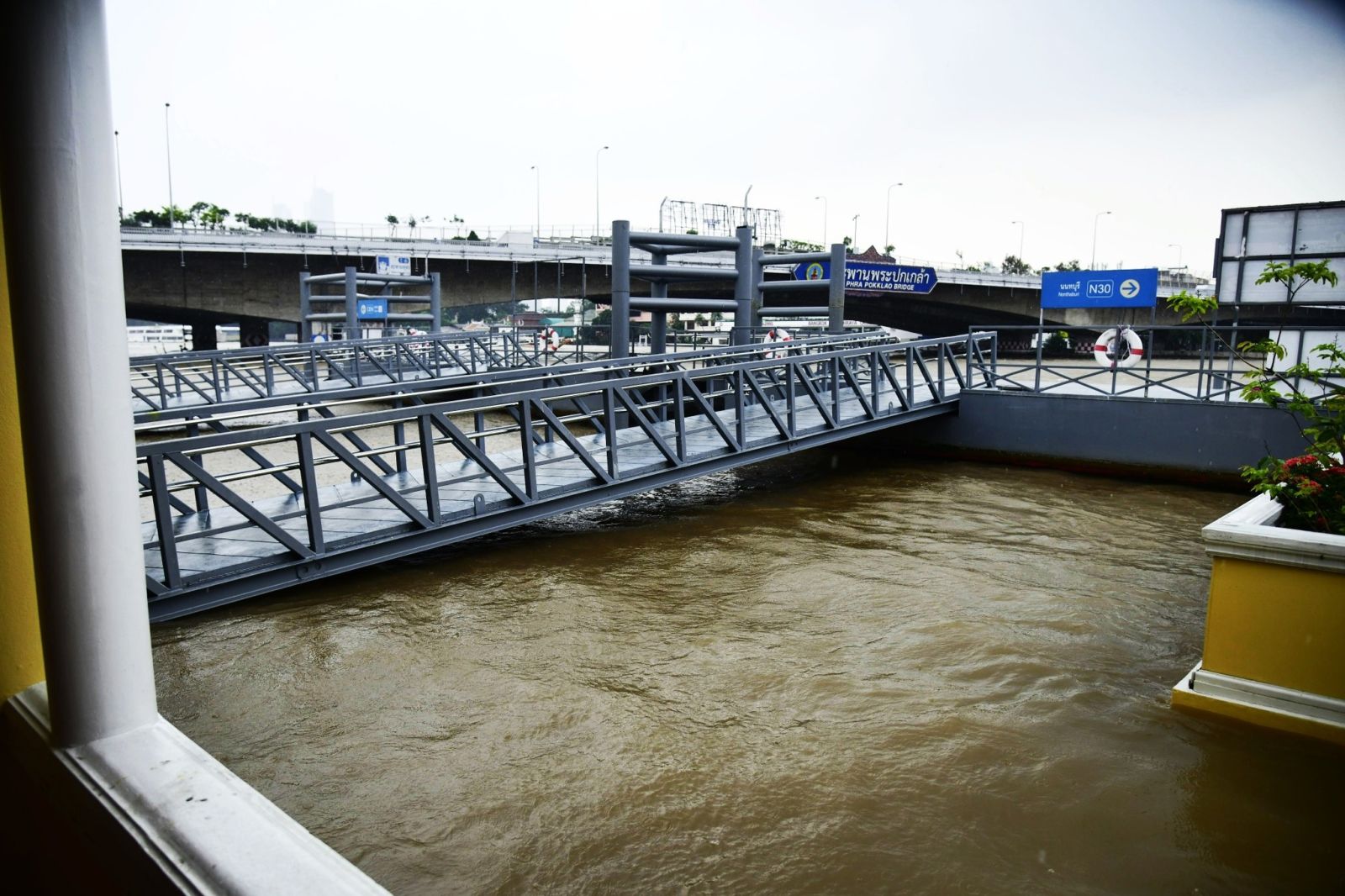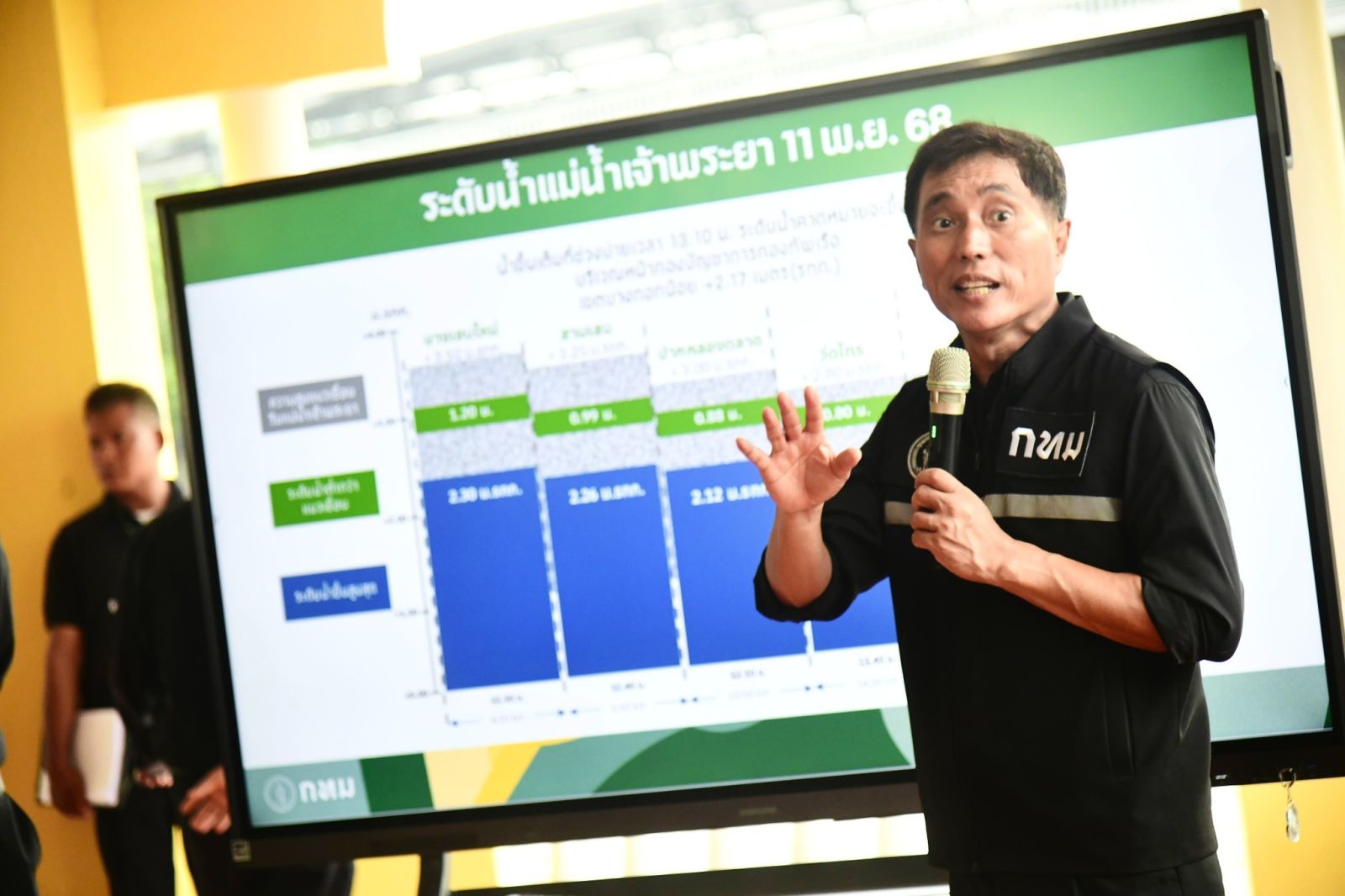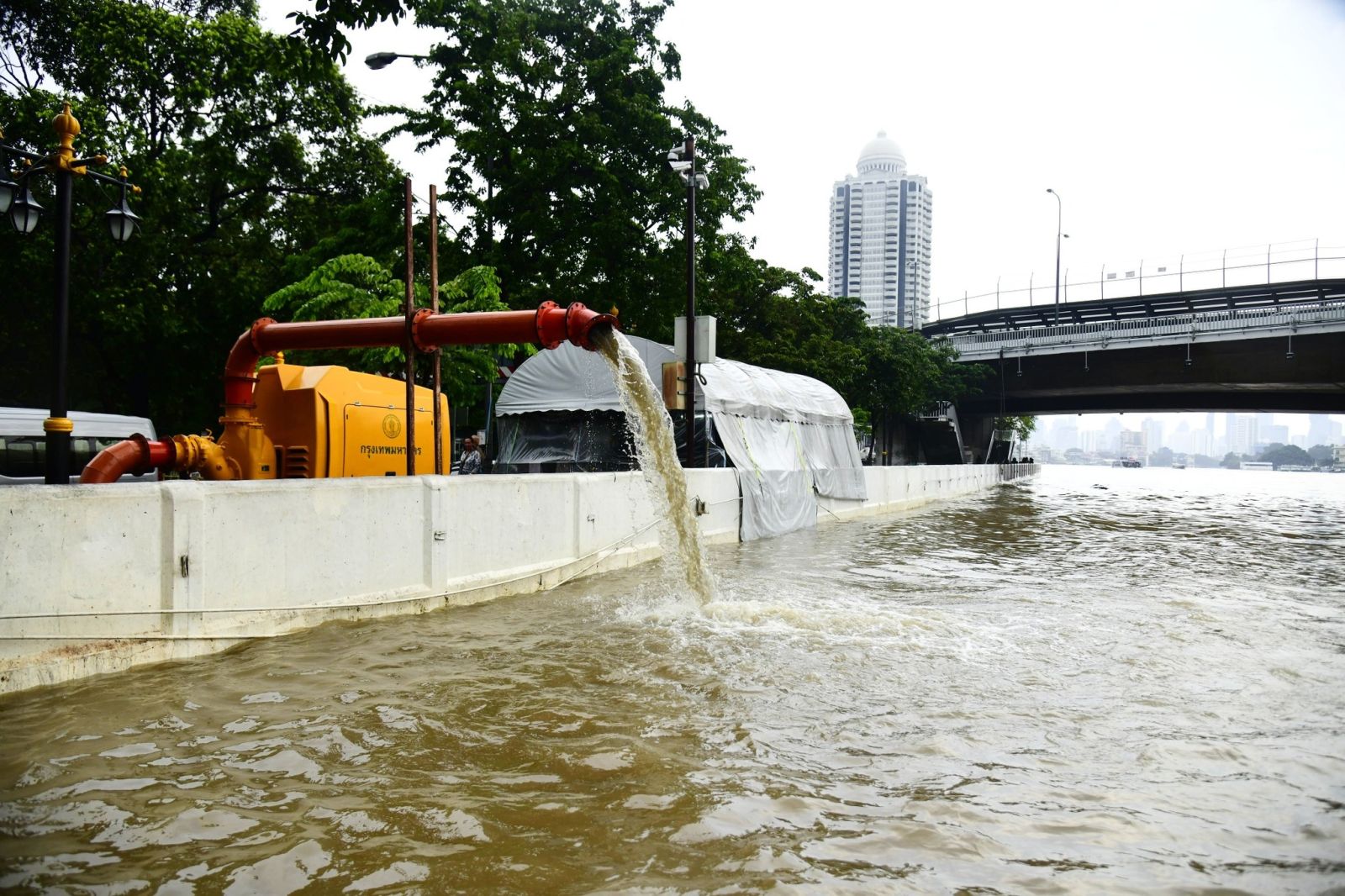 ด้านรองผู้ว่าราชการกรุงเทพมหานคร กล่าวเสริมว่า กทม. สร้างแนวเขื่อนป้องกันน้ำริมเจ้าพระยาไล่ระดับความสูงมาจากทางเหนือ เช่น พื้นที่ติดนนทบุรีจะมีเขื่อนกั้นน้ำสูงกว่า 3.5 เมตร ขณะนี้ที่เราอยู่กันที่สะพานพุทธฯ ปากคลองตลาด จะเห็นว่ามีแนวเขื่อนป้องกันน้ำริมเจ้าพระยาสูงประมาณ 3 เมตร ซึ่งน้ำเหมือนจะปริ่มล้นแนวเขื่อนกั้นน้ำ แต่ก็ยังต่ำกว่าระดับเขื่อนกั้นน้ำอีกมากกว่า 80 ซม. ซึ่งกทม.เฝ้าระวังอย่างใกล้ชิดอยู่ตลอดเวลา จึงขอให้ประชาชนอุ่นใจไม่ต้องกังวล