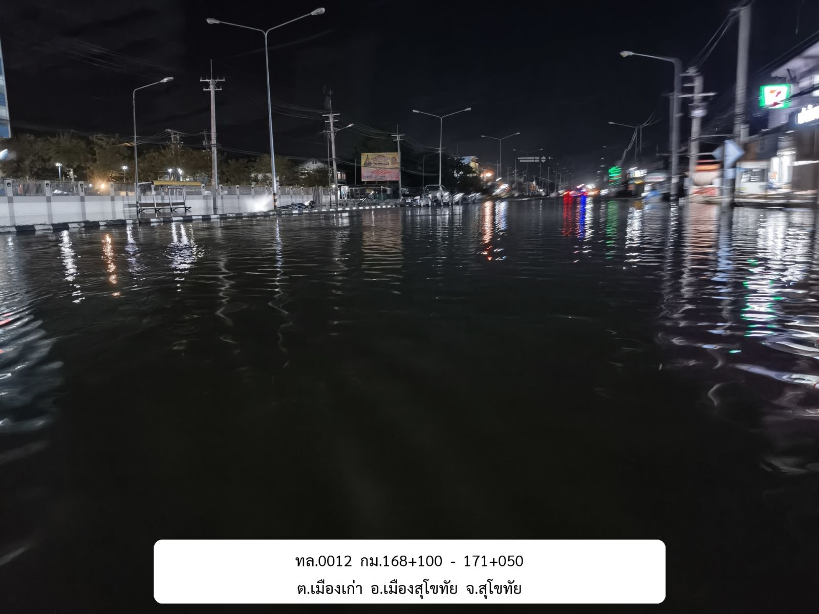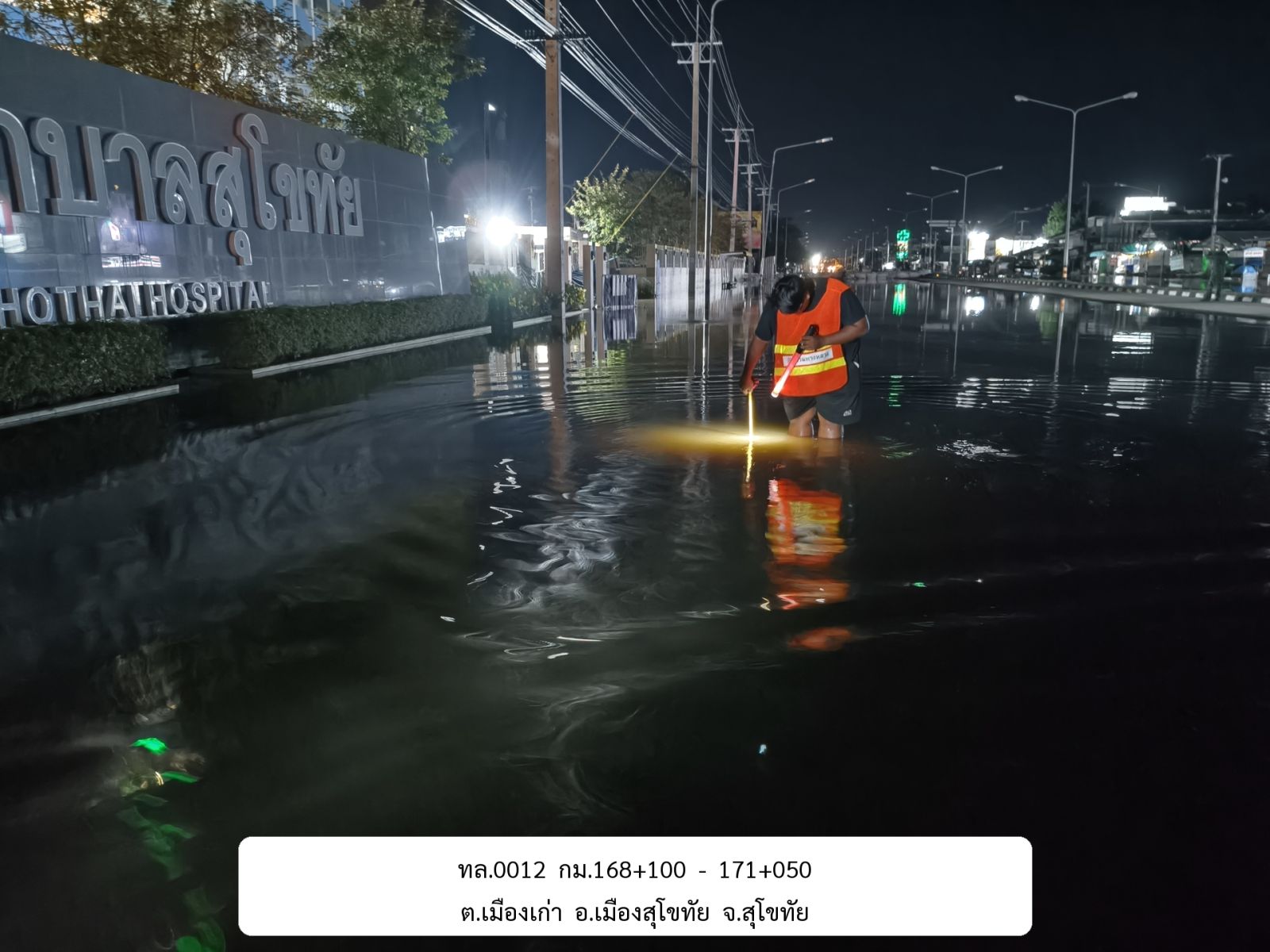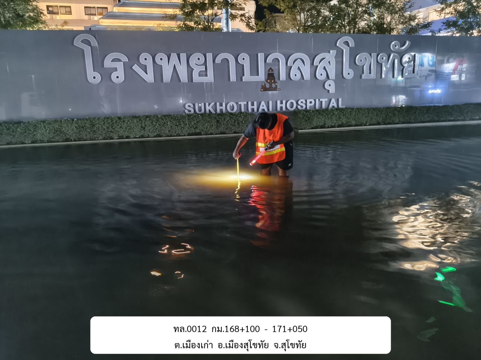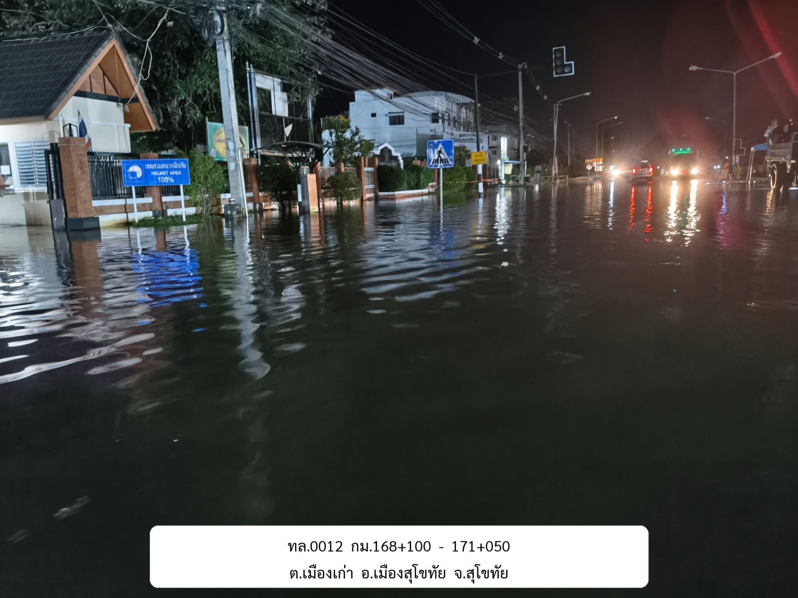 วันพุธที่ 12 พฤศจิกายน 2568 ข้อมูล ณ เวลา 19.13 น. แขวงทางหลวงสุโขทัย รายงานว่า ปิดการจราจรบริเวณทางหลวงหมายเลข 12 ตอน เมืองเก่า - สุโขทัย ระหว่าง กม.168+100 - กม.171+050 ระดับน้ำที่ 37 เซนติเมตร (ระดับน้ำคงที่)