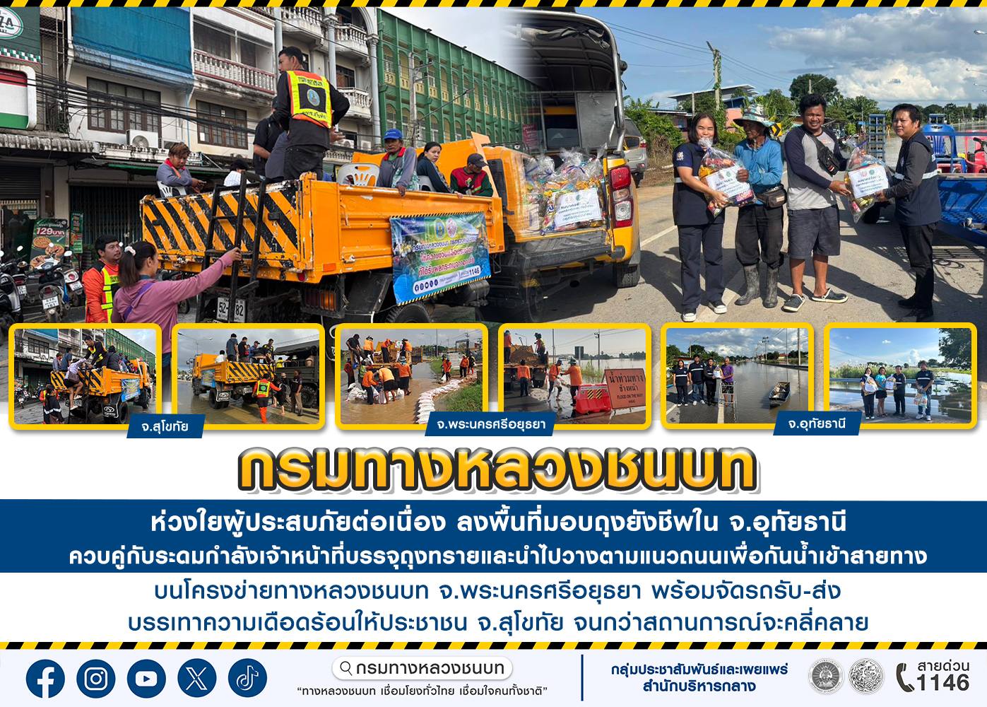 นอกจากนี้ แขวงทางหลวงชนบทพระนครศรีอยุธยา และหมวดบำรุงทางหลวงชนบทในสังกัด ได้ระดมกำลังเจ้าหน้าที่บรรจุถุงทราย เพื่อนำกระสอบทรายไปวางกั้นน้ำสองข้างทาง ไม่ให้มวลน้ำไหลเข้าท่วมถนนทางหลวงชนบทสาย อย.4044 แยก ทล.3454 (กม.ที่ 7+500) – บ้านเจ้าเจ็ด อำเภอเสนา และถนนทางหลวงชนบทสาย อย.4031 แยก ทล.3412 - บ้านแค อำเภอบางบาล, เสนา, ผักไห่ จังหวัดพระนครศรีอยุธยา รวมไปถึง แขวงทางหลวงชนบทสุโขทัย ซึ่งยังคงบูรณาการร่วมกับจังหวัดสุโขทัยในการสนับสนุนรถบรรทุก รับ-ส่ง ประชาชน ผู้ป่วย และบุคลากรทางการแพทย์ของโรงพยาบาลสุโขทัยอย่างต่อเนื่องจนกว่าสถานการณ์จะคลี่คลาย
