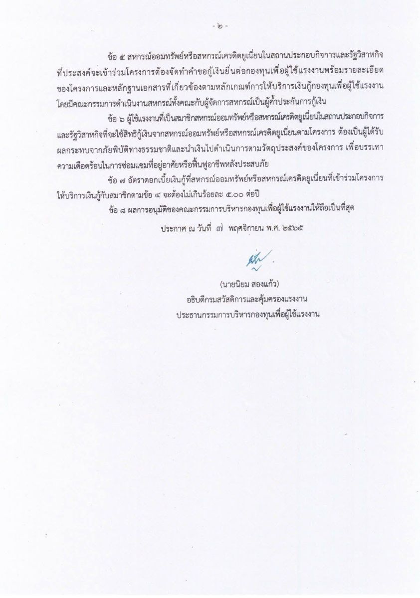 อธิบดี กสร. กล่าวเพิ่มเติมว่า นอกจากนี้ กรมฯ ได้จัดเตรียม “โครงการเงินกู้เพื่อบรรเทาผลกระทบจากภัยพิบัติทางธรรมชาติ” โดยปล่อยกู้ดอกเบี้ยต่ำผ่านสหกรณ์ออมทรัพย์หรือสหกรณ์เครดิตยูเนี่ยนในสถานประกอบกิจการและรัฐวิสาหกิจ สามารถยื่นคำขอกู้เงินจากกองทุนฯ ได้สูงสุดถึงสหกรณ์ละ 20 ล้านบาทด้วยอัตราดอกเบี้ยพิเศษเพียงร้อยละ 2.00 ต่อปี เพื่อนำไปปล่อยกู้ให้ลูกจ้างใช้ซ่อมแซมที่อยู่อาศัยหรือฟื้นฟูอาชีพที่เสียหายหลังประสบภัย