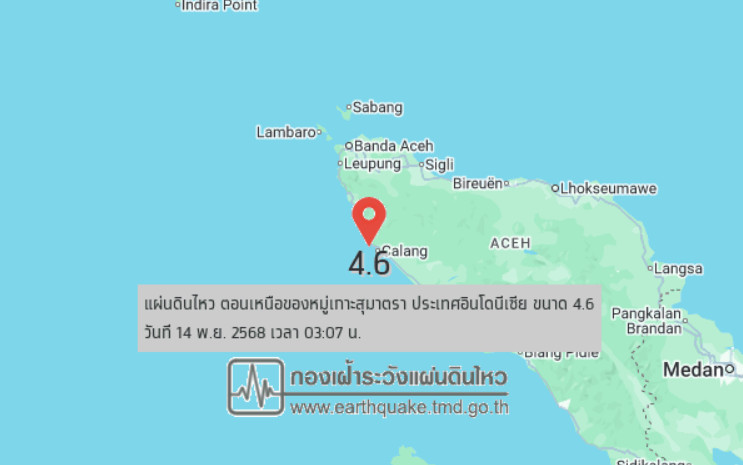 วันที่ 14 พ.ย. 2568 เวลา 03.07 น. กองเฝ้าระวังแผ่นดินไหว กรมอุตุนิยมวิทยา แจ้งเหตุ แผ่นดินไหว ขนาด 4.6 ความลึก 10 กม. บริเวณทางตอนเหนือของหมู่เกาะสุมาตรา ประเทศอินโดนีเซีย (4.66°N,95.50°E) ศูนย์กลางห่างออกไปทางทิศตะวันตกเฉียงใต้ของ อ.เมือง จ.ภูเก็ต ประมาณ 480 กม. ยังไม่มีรายงานผลกระทบต่อประเทศไทย