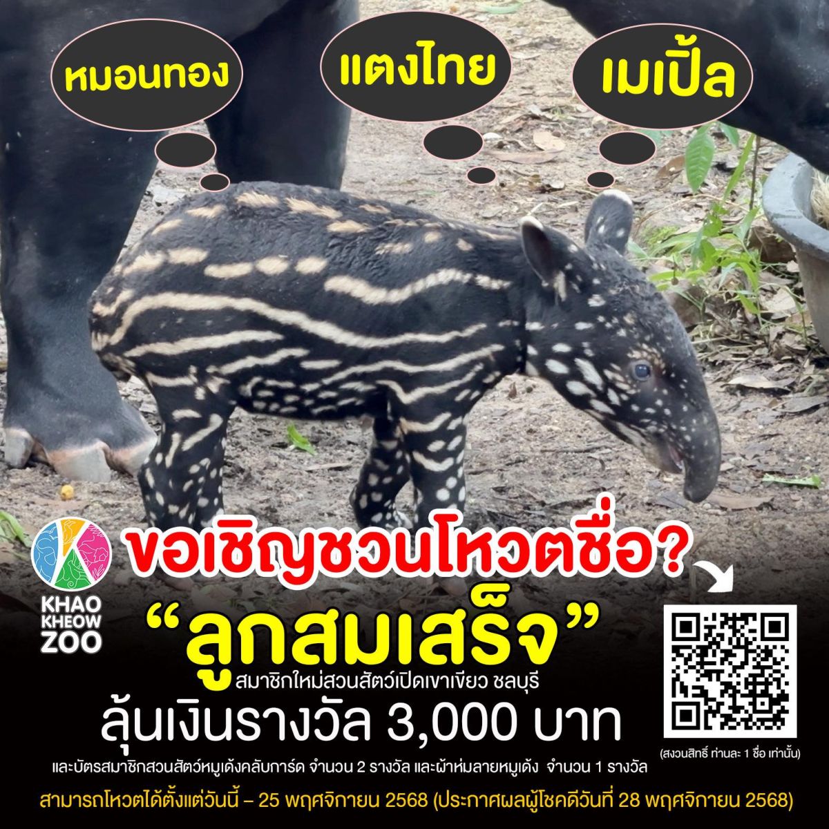 วันที่ (15 พฤศจิกายน 2568) นายณรงวิทย์ ชดช้อย ผู้อำนวยการสวนสัตว์เปิดเขาเขียว เปิดเผยว่า เมื่อวันที่ 28 กันยายน 2568 ที่ผ่านมาสวนสัตว์เปิดเขาเขียวเปิดตัวสมาชิกใหม่ตัวล่าสุด “ลูกสมเสร็จ” เพศเมียจำนวน 1 ตัว จากพ่อ “ปีใหม่” อายุ 14 ปี และแม่ “ตุลยา” อายุ 12 ปี ขณะนี้มีสุขภาพแข็งแรงดี เแต่ยังไม่มีชื่อ สวนสัตว์เปิดเขาเขียวจึงเชิญชวนนักเที่ยวและประชาชนทั่วไปเข้าร่วมกิจกรรมโหวตเลือกชื่อ “ลูกสมเสร็จ” คือ “หมอนทอง แตงไทย หรือ เมเปิ้ล” ลุ้นรับเงินรางวัล 3,000 บาท จำนวน 1 รางวัล บัตรสมาชิกสวนสัตว์หมูเด้งคลับการ์ด จำนวน 2 รางวัล และผ้าห่มลายหมูเด้ง จำนวน 1 รางวัล