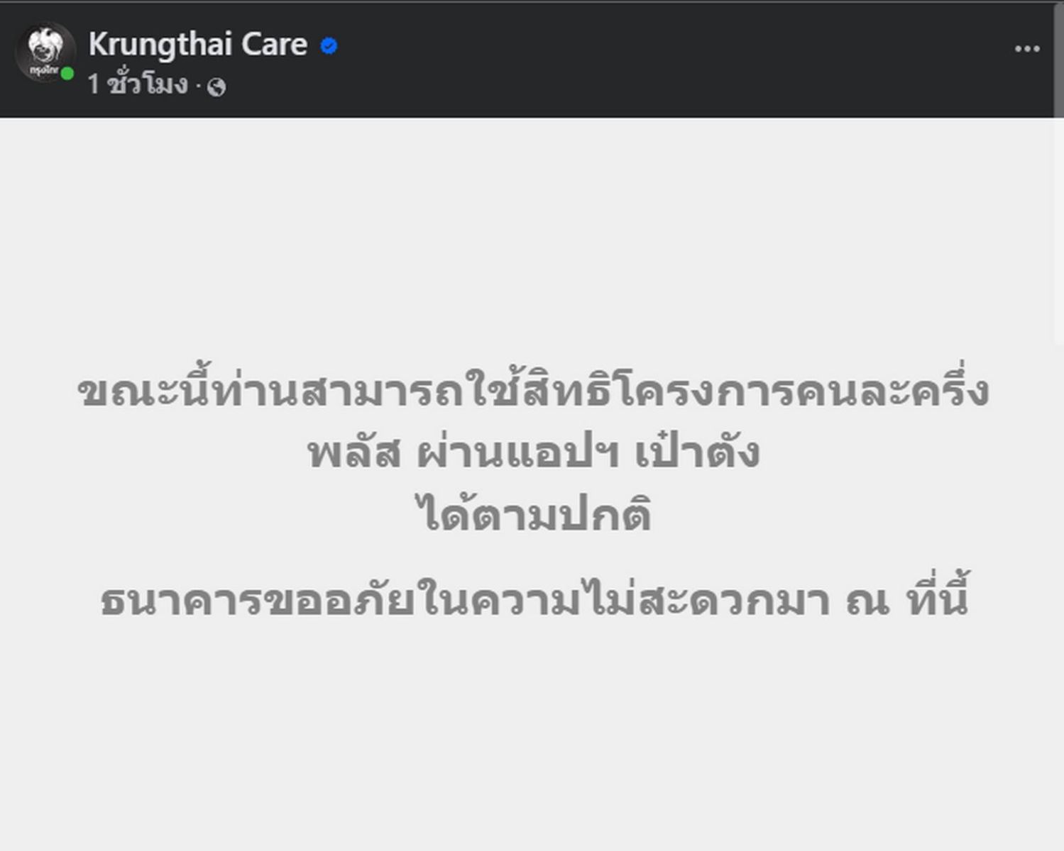 มีรายงานว่า ล่าสุด ธนาคาร กรุงไทยแก้ไขเรียบร้อยแล้ว พร้อมแจ้งว่า "ขณะนี้สามารถใช้สิทธิคนละครึ่งพลัส ผ่านแอปฯ เป๋าตังได้ตามปกติแล้ว ธนาคารขออภัยในความไม่สะดวกมา ณ ที่นี้"