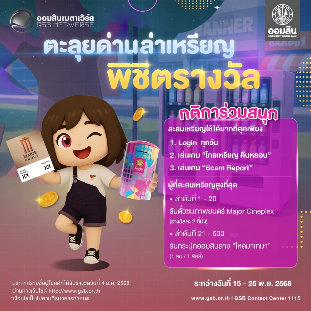 ไม่ว่าจะอยู่ที่ไหน ก็สนุกกับ ออมสินเมตาเวิร์ส ได้! เตรียมตัวให้พร้อม แล้วมาทำภารกิจสุดมันส์ในโลกเสมือนจริง เพื่อชิงรางวัลรวม 500 รางวัล!