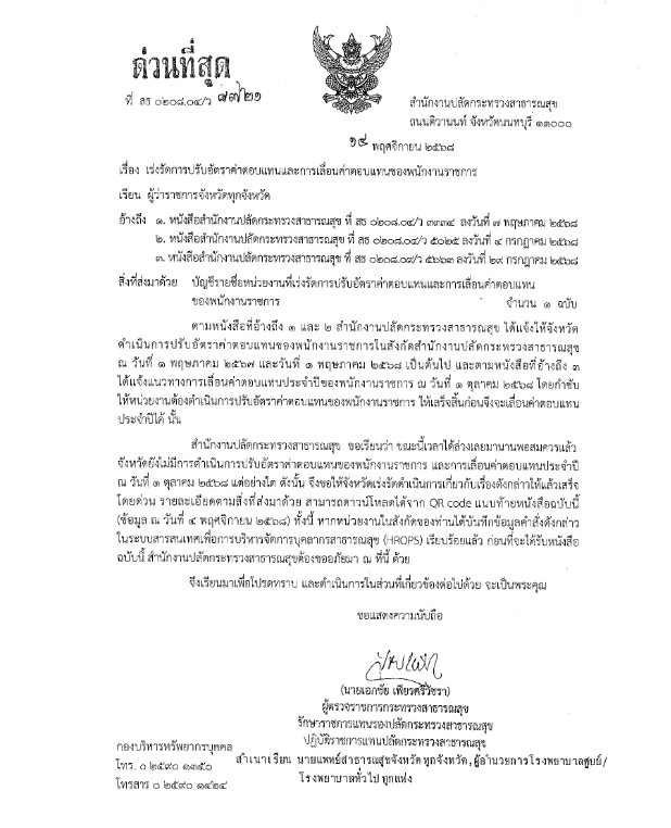 นพ.เอกชัย เพียรศรีวัชรา ผู้ตรวจราชการกระทรวงสาธารณสุข รักษาราชการแทนรองปลัดกระทรวงสาธารณสุข ปฏิบัติราชการแทนปลัดกระทรวงสาธารณสุข สํานักงานปลัดกระทรวงสาธารณสุข ลงนามในหนังสือ เรื่อง เร่งรัดการปรับอัตราค่าตอบแทนและการเลื่อนค่าตอบแทนของพนักงานราชการ เมื่อวันที่ 14 พ.ย. 68 ถึงผู้ว่าราชการจังหวัดทุกจังหวัด