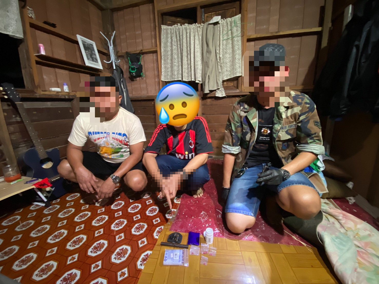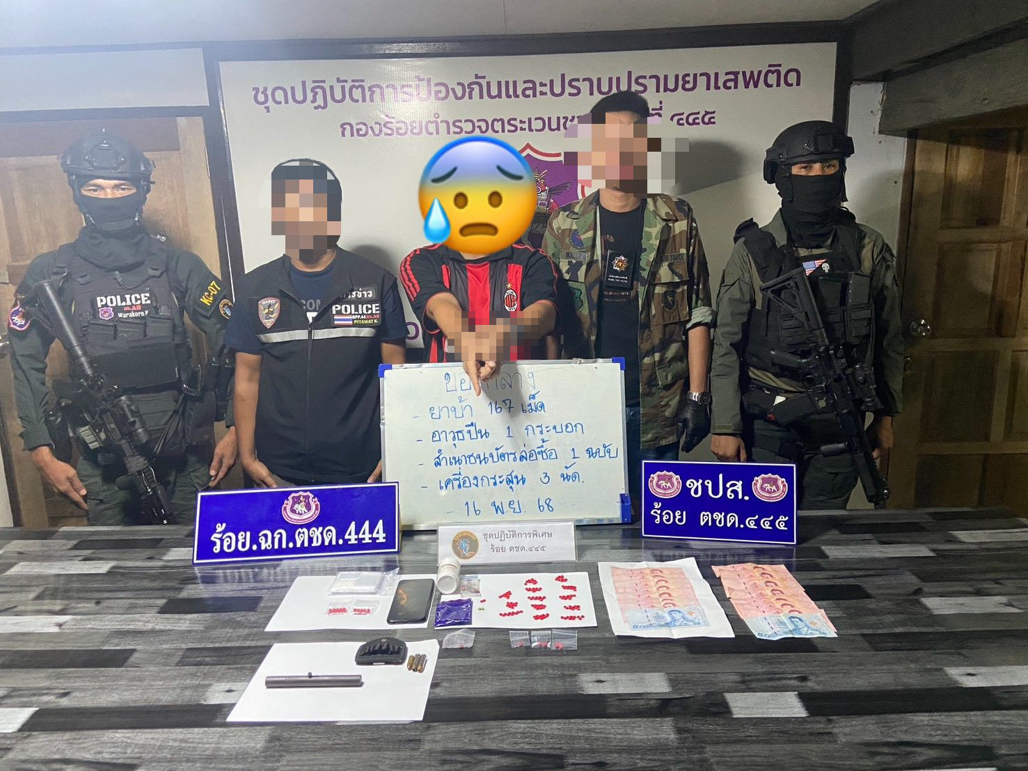 เจ้าหน้าที่ได้วางแผนเข้าติดต่อล่อซื้อยาบ้า จำนวน 25 เม็ด ราคา 750 บาท โดยนัดส่งยาบ้าบริเวณริมถนนประชาธิปัตย์ ภายในชุมชน เมื่อถึงเวลานัดหมาย นายนอ (นามสมมุติ) อายุ 25 ปี ได้เดินนำยาบ้ามาส่งให้ เจ้าหน้าที่จึงแสดงตัวจับกุมได้พร้อมธนบัตรล่อซื้อ และจากการตรวจค้นบ้าน ซึ่งเป็นบ้านที่นายนอ พักอาศัยอยู่ในชุมชน ก็พบยาบ้าอีก 142 เม็ด อยู่ในเสื้อหนาว รวม ยาบ้าทั้งหมดจำนวน 167 เม็ดเจ้าหน้าที่ยังค้นพบอาวุธปืนไทยประดิษฐ์ (ปืนปากกา) ขนาด .38 มม.จำนวน 1 กระบอก กระสุนปืน ขนาด .38 SUPER+P จำนวน 1 นัด, ขนาด .357 MAGNUM จำนวน 1 นัด, ขนาด.357 MAG จำนวน 1 นัด รวมกระสุนทั้งหมด 3 นัด อยู่ภายในห้องนอนชั้นสองของบ้าน
