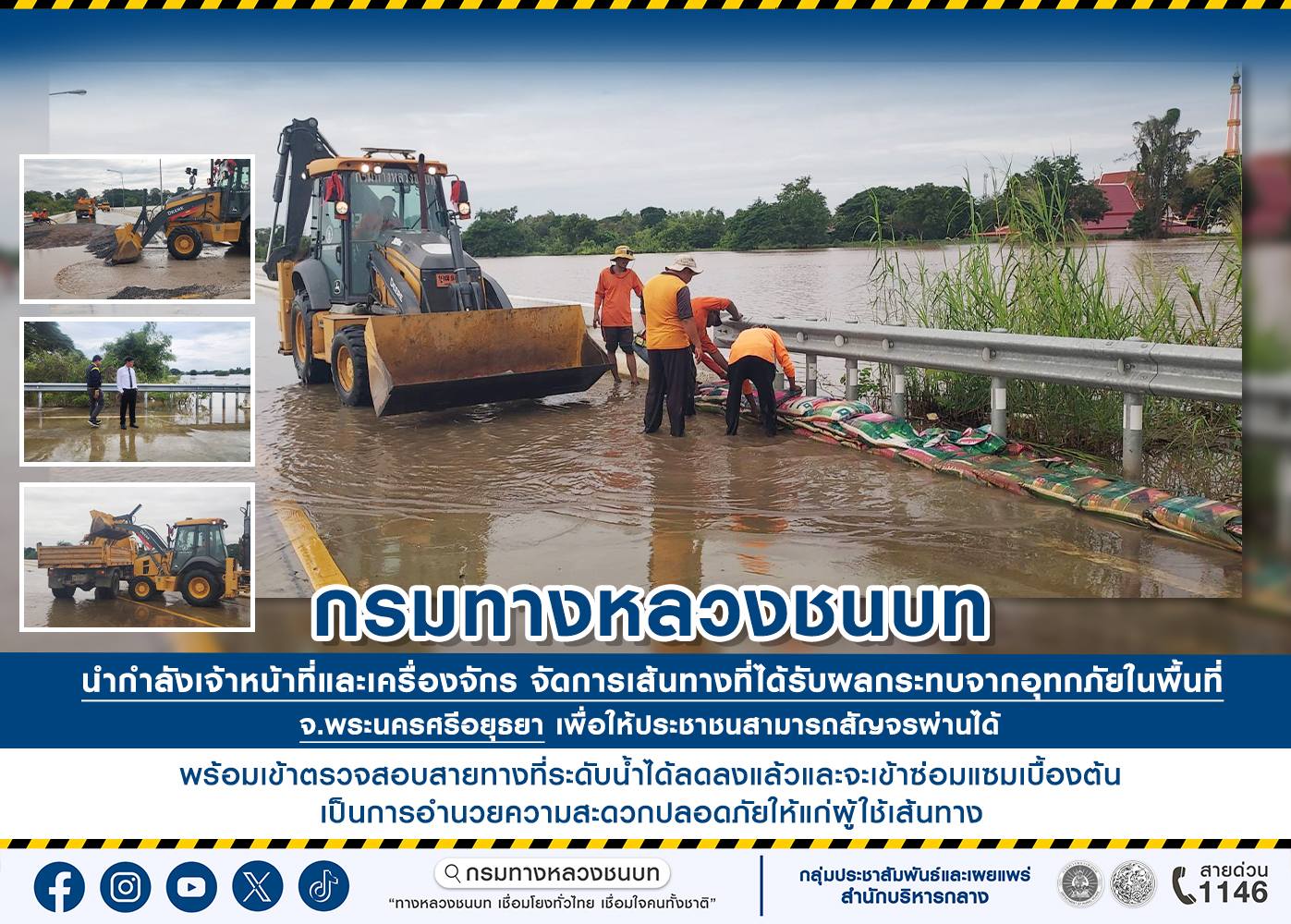 กรมทางหลวงชนบท นำกำลังเจ้าหน้าที่และเครื่องจักร จัดการเส้นทางที่ได้รับผลกระทบจากอุทกภัยในพื้นที่ จ.พระนครศรีอยุธยา เพื่อให้ประชาชนสามารถสัญจรผ่านได้ พร้อมเข้าตรวจสอบสายทางที่ระดับน้ำได้ลดลงแล้วและจะเข้าซ่อมแซมเบื้องต้นเป็นการอำนวยความสะดวกปลอดภัยให้แก่ผู้ใช้เส้นทาง