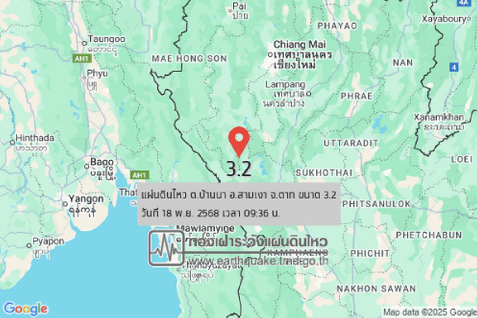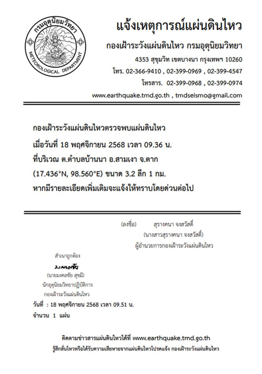 วันที่ 18 พฤศจิกายน กองเฝ้าระวังแผ่นดินไหว กรมอุตุนิยมวิทยา รายงานว่า เมื่อเวลา 09.36 น. เกิดแผ่นดินไหว ขนาด 3.2 ความลึก 1 กิโลเมตร บริเวณ ต.บ้านนา อ.สามเงา จ.ตาก เบื้องต้นยังไม่มีผู้แจ้งผลกระทบ หากมีรายละเอียดเพิ่มเติมจะแจ้งให้ทราบโดยด่วนต่อไป