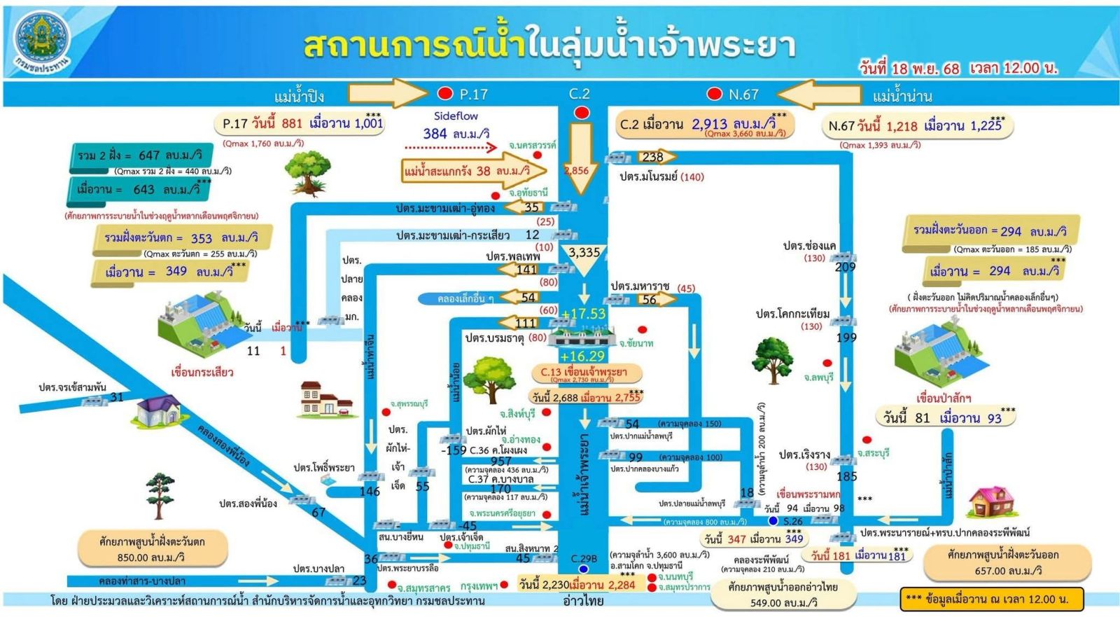 ในส่วนของสถานการณ์น้ำลุ่มเจ้าพระยา เวลา 12.00 น. ที่สถานีวัดน้ำ C.2 อ.เมือง จ.นครสวรรค์ มีปริมาณไหลผ่านในอัตรา 2,856 ลบ.ม./วินาที กรมชลประทานรับน้ำเข้าระบบชลประทานฝั่งตะวันตกและฝั่งตะวันออกอย่างเต็มศักยภาพ รวม 647 ลบ.ม./วินาที ทำให้ปัจจุบันระดับน้ำท้ายเขื่อนเจ้าพระยามีปริมาณไหลผ่าน 2,688 ลบ.ม./วินาที