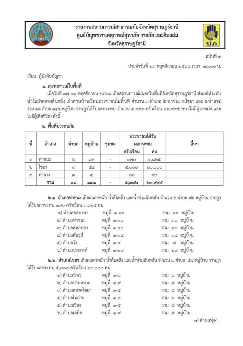 เพจสำนักงานประชาสัมพันธ์จังหวัดสุราษฯ โพสต์รายงาน จากเหตุการณ์เกิดฝนตกต่อเนื่องในวันที่ 17–19 พฤศจิกายน 2568 ส่งผลให้หลายพื้นที่ของจังหวัดสุราษฎร์ธานีประสบปัญหาน้ำล้นตลิ่งและน้ำท่วมฉับพลัน ครอบคลุม 3 อำเภอ ได้แก่ อำเภอท่าชนะ อำเภอไชยา และอำเภอท่าฉาง รวม 18 ตำบล 141 หมู่บ้าน มีประชาชนได้รับผลกระทบ 23,995 คน แม้ยังไม่มีผู้บาดเจ็บหรือเสียชีวิต แต่หลายจุดยังคงมีน้ำท่วมขัง โดยเฉพาะอำเภอไชยาที่ได้รับผลกระทบมากที่สุด