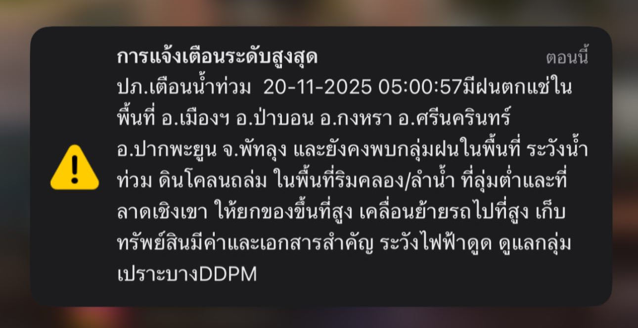 เวลา 05.00 น. วันที่ 20 พฤศจิกายน 2568 ปภ. เตือนน้ำท่วม เนื่องจากมีฝนตกแช่ ในพื้นที่ อ.เมือง อ.ป่าบอน อ.กงหรา อ.ศรีนครินทร์ อ.ปากพยูน จ.พัทลุง
