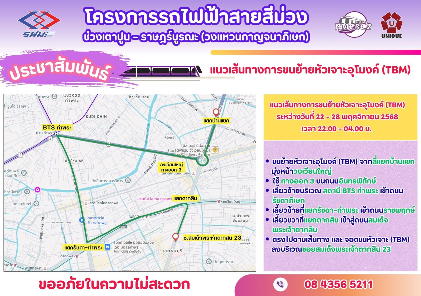 #ประชาสัมพันธ์ แนวเส้นทางขนย้ายหัวเจาะอุโมงค์ (TBM) โดย บริษัท ยูนิค เอ็นจิเนียริ่ง แอนด์ คอนสตรัคชั่น จำกัด (มหาชน) ผู้รับจ้างงานออกแบบและก่อสร้างอุโมงค์ทางวิ่งและสถานีใต้ดิน โครงการรถไฟฟ้าสายสีม่วง ช่วงเตาปูน - ราษฎร์บูรณะ (วงแหวนกาญจนาภิเษก) สัญญาที่ 4 ช่วงสะพานพุทธ - ดาวคะนอง ระหว่างวันที่ 22 – 28 พฤศจิกายน 2568 เวลา 22.00 – 04.00 น..