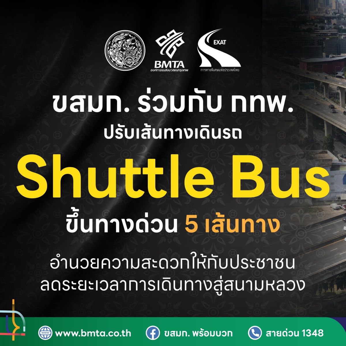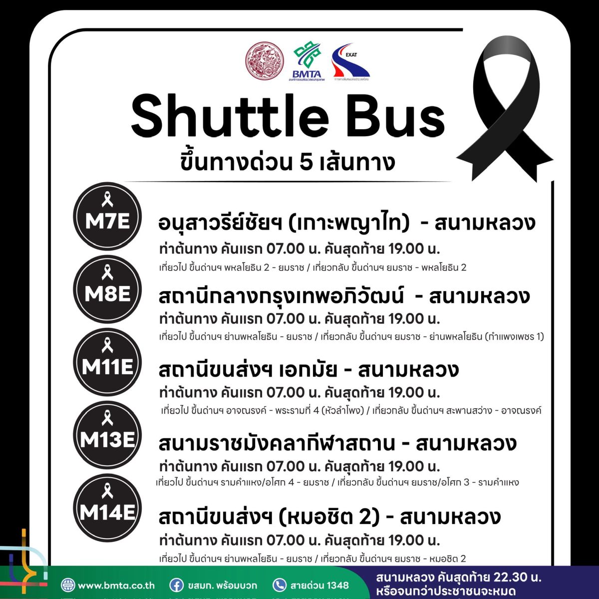 ขสมก. ปรับเส้นทางรถ Shuttle Bus จำนวน 5 เส้นทางขึ้นทางด่วน เพื่อเพิ่มความรวดเร็วและประสิทธิภาพในการเดินทางของประชาชนที่มุ่งหน้าไปถวายสักการะพระบรมศพ ณ พระที่นั่งดุสิตมหาปราสาท โดยได้รับความร่วมมือจากการทางพิเศษฯ งดเว้นค่าผ่านทางให้รถ Shuttle Bus ทุกคัน