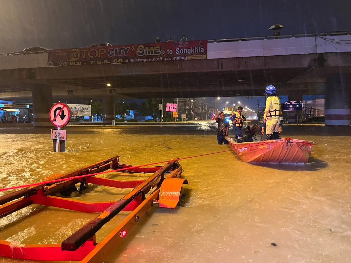 (22 พ.ย.68) เวลา 01.30 น. ชุดกู้ภัย 203 พร้อมเรือท้องแบน เข้าเคลื่อนย้ายผู้ประสบภัย ติดค้างอยู่ภายใน ปั๊มน้ำมันคลองหวะ ถนนเลี่ยงเมือง (สายเอเชีย) อำเภอหาดใหญ่ จังหวัดสงขลา