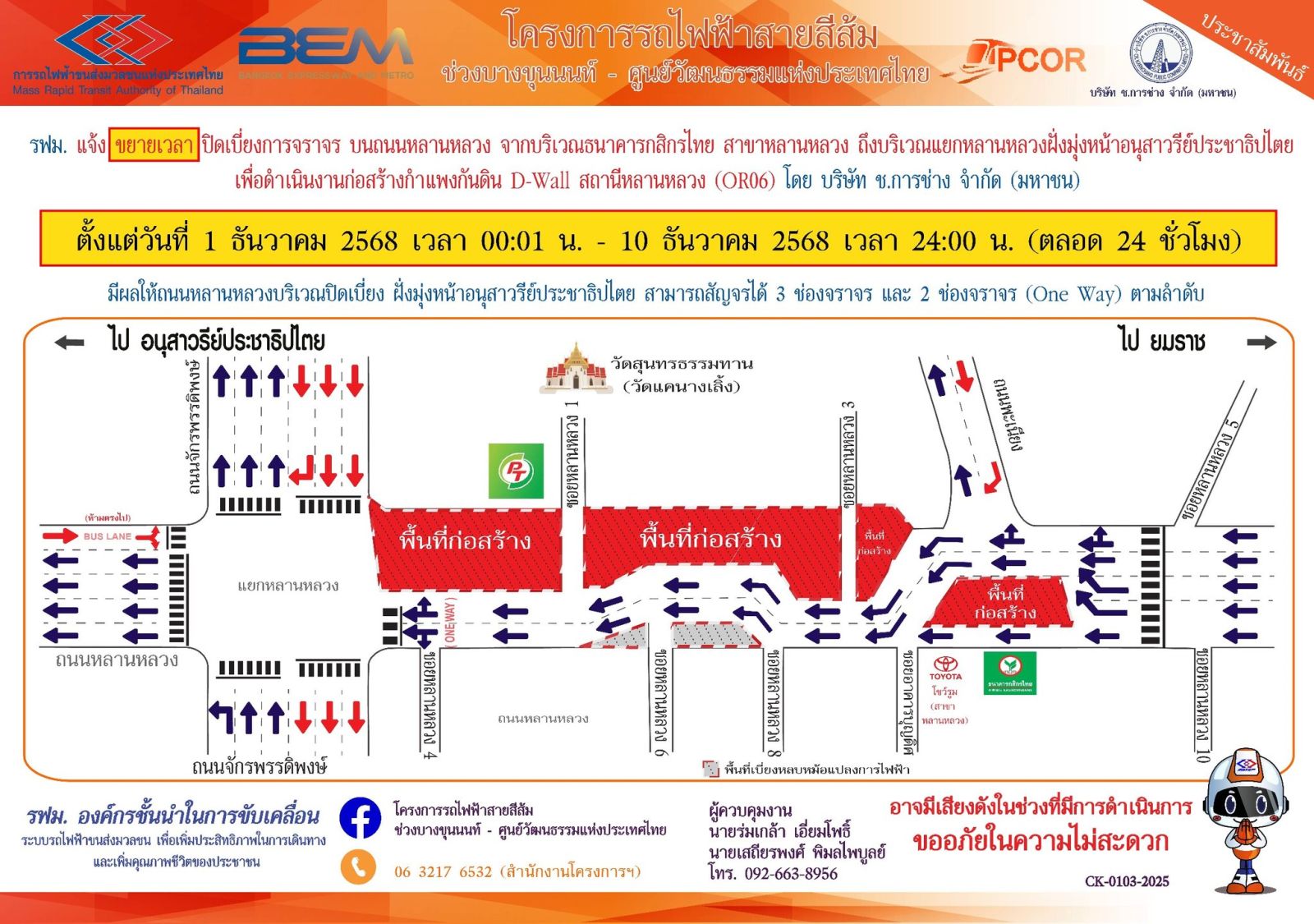 การรถไฟฟ้าขนส่งมวลชนแห่งประเทศไทย (รฟม.) แจ้งว่า บริษัท ช.การช่าง จำกัด (มหาชน) ผู้รับจ้างออกแบบและก่อสร้างอุโมงค์ทางวิ่งและสถานีใต้ดิน โครงการรถไฟฟ้าสายสีส้ม ช่วงบางขุนนนท์ – ศูนย์วัฒนธรรมแห่งประเทศไทย มีความจำเป็นต้องขยายเวลาปิดเบี่ยงการจราจร บนถนนหลานหลวง จากบริเวณธนาคารกสิกรไทย สาขาหลานหลวง ถึง บริเวณแยกหลานหลวง ฝั่งมุ่งหน้าอนุสาวรีย์ประชาธิปไตย เพื่อดำเนินงานก่อสร้างกำแพงกันดิน D-Wall สถานีหลานหลวง (OR06) ตั้งแต่วันที่ 1 ธันวาคม 2568 เวลา 00.01 น. – 10 ธันวาคม 2568 เวลา 24.00 น. (ตลอด 24 ชั่วโมง) มีผลให้ถนนหลานหลวงบริเวณปิดเบี่ยง ฝั่งมุ่งหน้าอนุสาวรีย์ประชาธิปไตย สามารถสัญจรได้ 3 ช่องจราจร และ 2 ช่องจราจร (One Way) ตามลำดับ โดยประชาชนสามารถเข้า – ออกที่พักอาศัยได้ตามปกติ