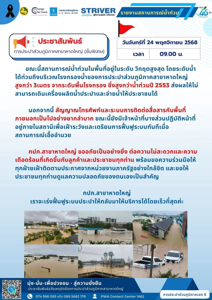 กปภ.สาขาหาดใหญ่ ขออภัยเป็นอย่างยิ่ง ต่อความไม่สะดวกและความเดือดร้อนที่เกิดขึ้นกับลูกค้าและประชาชนทุกท่าน พร้อมขอความร่วมมือให้ทุกฝ่ายเฝ้าติดตามประกาศจากหน่วยงานภาครัฐอย่างใกล้ชิด และขอให้ประชาชนทุกท่านดูแลความปลอดภัยของตนเองเป็นสำคัญ