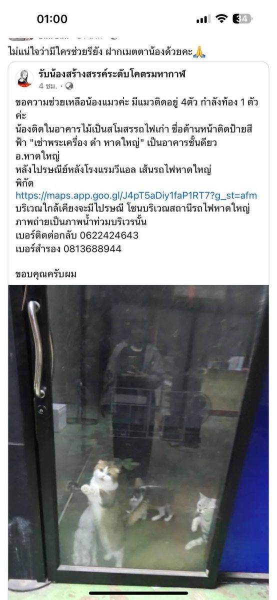 วันที่ 24 พฤศจิกายน 2568 กรณี น้ำท่วม อ.หาดใหญ่ จ.สงขลา นอกจากประชาชนที่ได้รับความเดือดร้อนแล้วยังมีสัตว์เลี้ยงได้รับผลกระทบไปด้วย กรณีนี้เช่นกัน น้องแมว 3 ตัว ที่เจ้าของเกิดป่วยตั้งแต่ก่อนน้ำท่วมและเข้ารับการรักษาอยู่ที่รพ.หลายวัน ได้มีการโพสขอความช่วยเหลือในกลุ่ม ให้ช่วยเหลือขนย้ายน้องแมว 3 ตัวที่อยู่ที่บ้านเพียงลำพังให้ปลอดภัย ณ บ้านที่ตั้งอยู่ที่ถนนเพชรเกษม ต.หาดใหญ่ อ.หาดใหญ่ สงขลา