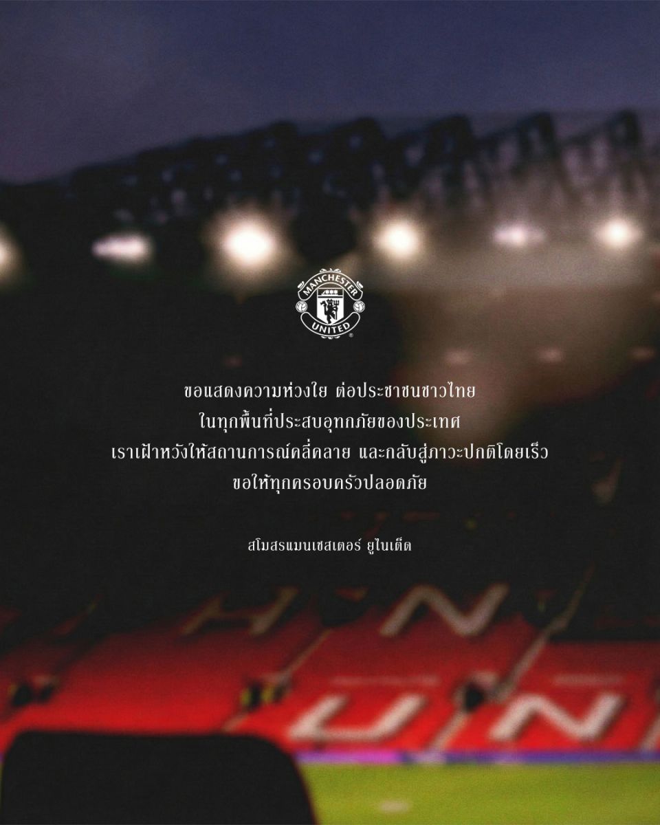 ล่าสุด มีรายงานว่า สโมสรฟุตบอล "แมนเชสเตอร์ ยูไนเต็ด" ปัจจุบันแข่งขันในพรีเมียร์ลีกซึ่งเป็นลีกสูงสุดของฟุตบอลอังกฤษ สโมสรมีฉายา "ปีศาจแดง" ได้ โพสต์ข้อความผ่านโซเชียลมีเดีย ส่งกำลังใจให้กับ แฟนบอลชาวไทยและประชาชนที่ได้รับผลกระทบ ด้วยความห่วงใยรายละเอียดระบุว่า "สโมสรแมนเชสเตอร์ ยูไนเต็ด ขอแสดงความห่วงใยพี่น้องชาวไทยในพื้นที่ประสบอุทกภัย ขอให้สถานการณ์คลี่คลายโดยเร็ว ขอให้ทุกชีวิตปลอดภัย" และโพสต์ข้อความเพิ่มเติ่ม ระบุว่า "ขอแสดงความห่วงใย ต่อประชาชนชาวไทย ในทุกพื้นที่ประสบอุทกภัยของประเทศ เราเฝ้าหวังให้สถานการณ์คลี่คลาย และ กลับสู่ภาวะปกติโดยเร็ว ขอให้ทุกครอบครัวปลอดภัย"