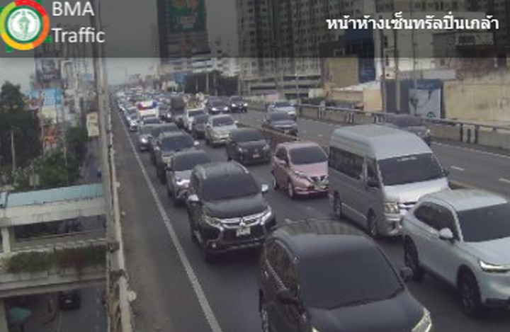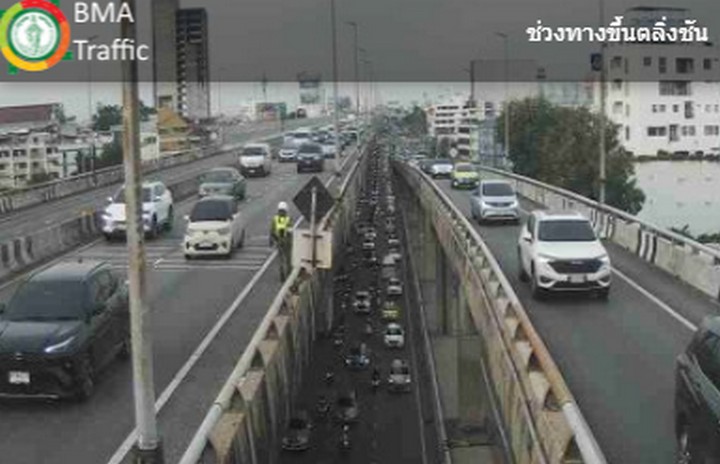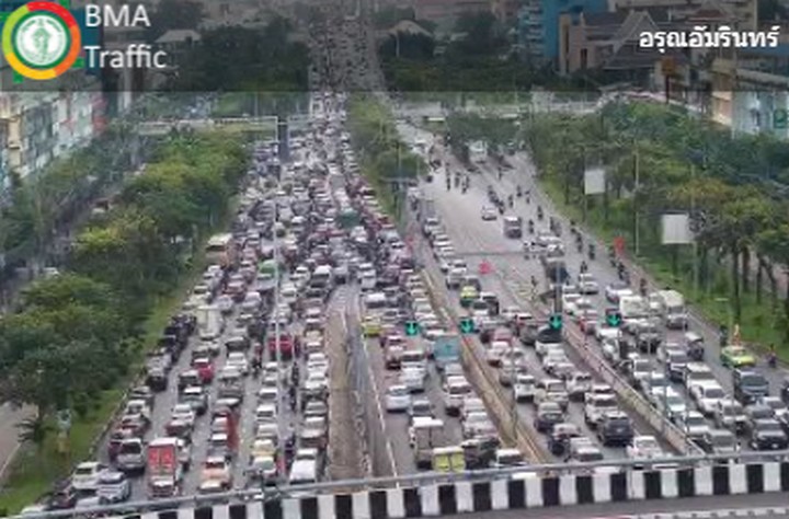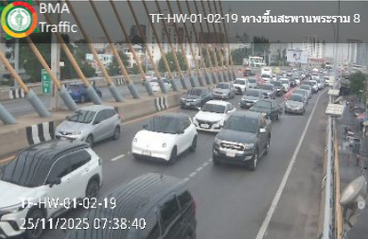 07.38 น. คู่ขนานลอยฟ้าบรมราชชนนี และถนนบรมราชชนนี ขาเข้า มุ่งหน้าปิ่นเกล้า ข้ามสะพานพระราม 8 และสะพานสมเด็จพระปิ่นเกล้า รถมาก ท้ายแถวสะสมต่อเนื่องโค้งสายใต้เก่าภาพ CCTV กทม.