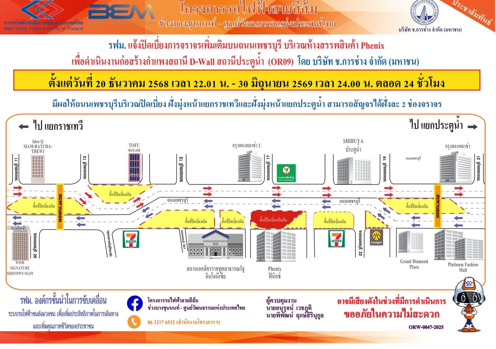การรถไฟฟ้าขนส่งมวลชนแห่งประเทศไทย (รฟม.) แจ้งว่า บริษัท ช.การช่าง จำกัด (มหาชน) ผู้รับจ้างออกแบบและก่อสร้างอุโมงค์ทางวิ่งและสถานีใต้ดิน โครงการรถไฟฟ้าสายสีส้ม ช่วงบางขุนนนท์ – ศูนย์วัฒนธรรมแห่งประเทศไทย มีความจำเป็นต้องปิดเบี่ยงการจราจรเพิ่มเติม บนถนนเพชรบุรี เพื่อดำเนินงานก่อสร้างกำแพงสถานี D-wall สถานีประตูน้ำ (OR09) โดยมีรายละเอียดดังนี้