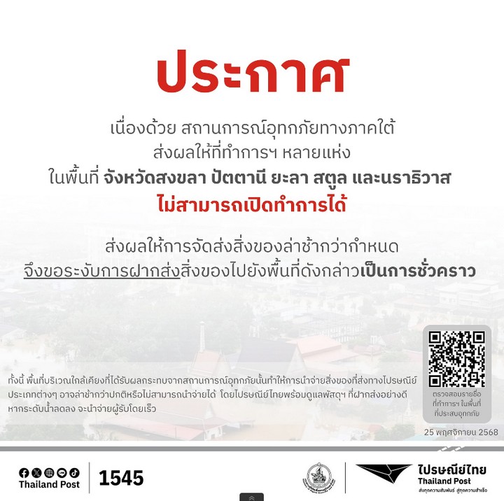สำหรับประชาชนที่ต้องการตรวจสอบพื้นที่ที่ได้รับผลกระทบในการนำจ่ายสิ่งของ สามารถติดตามรายละเอียดได้ที่เว็บไซต์ thailandpost.co.th หรือค้นหาที่ทำการไปรษณีย์ใกล้บ้านได้ที่ https://postbase.thailandpost.co.th/th/service-point และเช็คสถานพัสดุได้ที่ไลน์ :@Thailand Postไปรษณีย์ไทยพร้อมติดตามสถานการณ์อย่างใกล้ชิด และจะแจ้งความคืบหน้าเพิ่มเติม เพื่อให้ผู้ใช้บริการ ได้รับทราบข้อมูลอย่างต่อเนื่อง