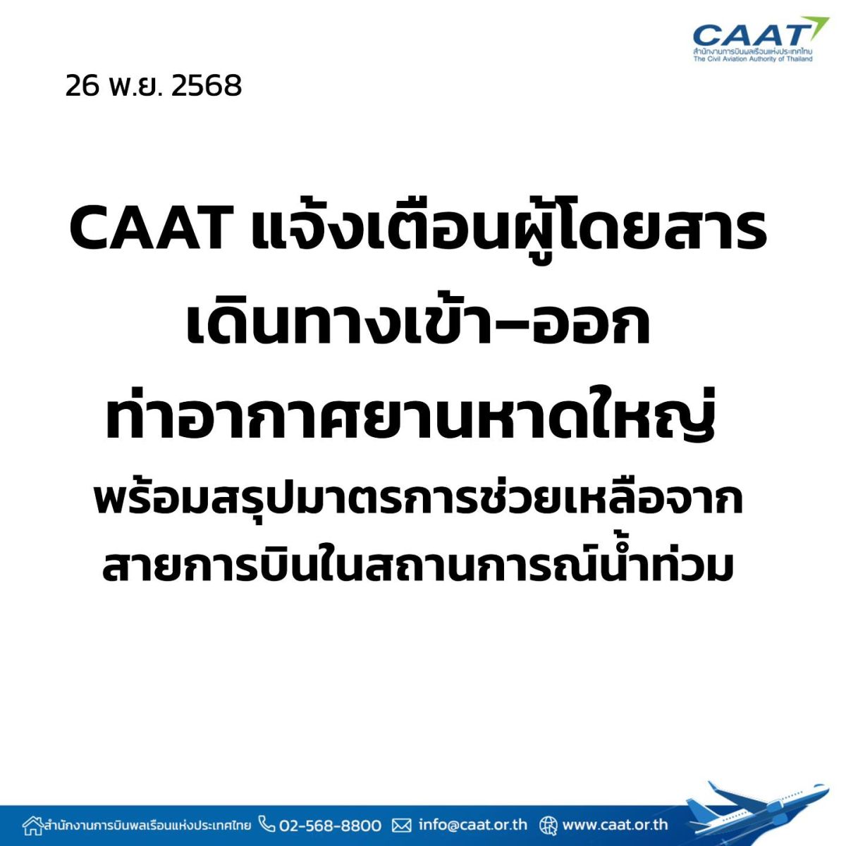 จากสถานการณ์น้ำท่วมในพื้นที่ อำเภอหาดใหญ่ จังหวัดสงขลา ซึ่งยังมีระดับน้ำสูงในหลายจุด ส่งผลให้การเดินทางเข้า–ออกท่าอากาศยานหาดใหญ่อาจประสบความลำบาก โดยเฉพาะรถรับ–ส่งผู้โดยสารของหน่วยงานรัฐที่จัดไว้ ซึ่งอาจไม่สามารถให้บริการได้ในบางช่วงเวลา ทำให้ผู้โดยสารอาจได้รับผลกระทบด้านความสะดวกในการเดินทาง CAAT ขอความร่วมมือผู้โดยสารพิจารณาความจำเป็นในการเดินทางในช่วงที่สถานการณ์น้ำยังไม่เสถียร หากต้องเดินทางไปหาดใหญ่ ควรมีผู้มารับที่สนามบินได้อย่างแน่นอน หากต้องเดินทางออกจากหาดใหญ่ให้เผื่อเวลาเดินทางไปสนามบินเพิ่มขึ้นอย่างมากเนื่องจากเส้นทางบางช่วงยังมีน้ำท่วม ทั้งนี้ โปรดติดตามสถานการณ์ล่าสุดจากสายการบิน เพื่อหลีกเลี่ยงการตกค้างในสนามบิน ซึ่งอาจมีข้อจำกัดด้านอาหาร น้ำดื่ม และพื้นที่พักคอย