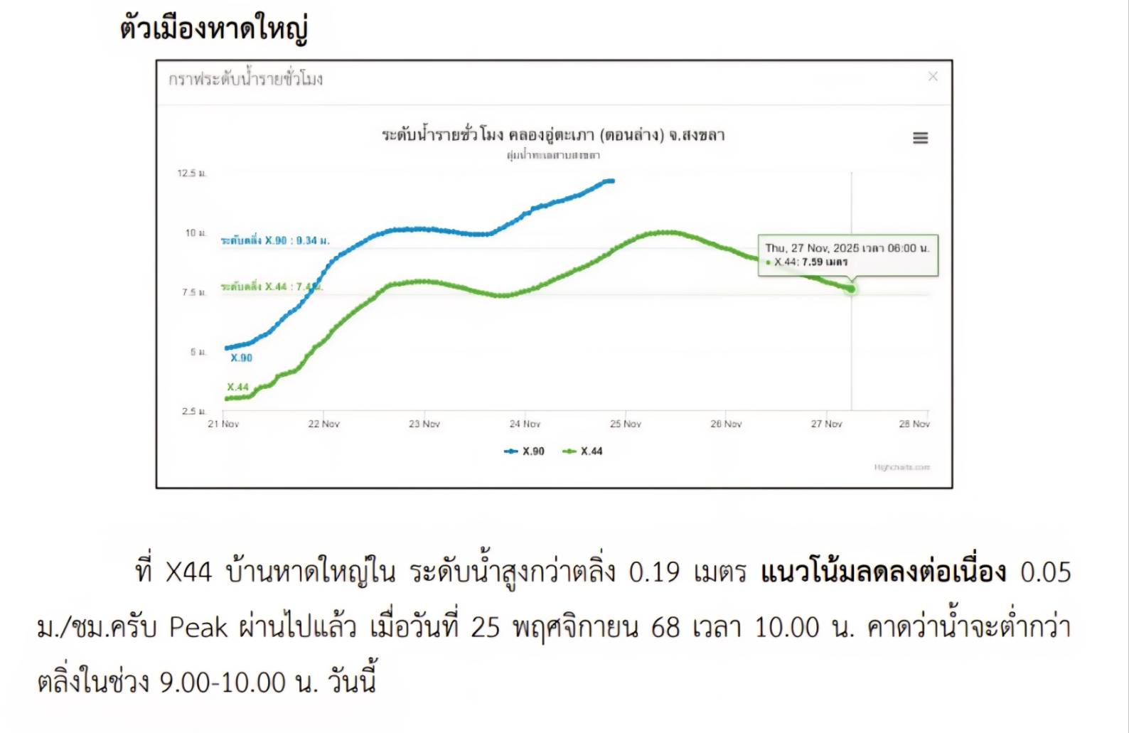 27 พฤศจิกายน 2568 นายธเนศร์ สมบูรณ์ ผู้อำนวยการสำนักบริหารจัดการน้ำและอุทกวิทยา เปิดเผยว่า ระดับน้ำในคลองอู่ตะเภาบริเวณสถานี X.44 บ้านหาดใหญ่ใน อำเภอหาดใหญ่ จังหวัดสงขลา ซึ่งเป็นสถานีสำคัญในการติดตามสถานการณ์น้ำท่วม ขณะนี้มีแนวโน้มลดลงต่อเนื่อง โดยวัดเช้านี้สูงกว่าตลิ่ง 19 เซนติเมตรและคาดว่า จะลดเข้าสู่ระดับตลิ่งได้ภายในช่วงก่อนเที่ยงวันนี้